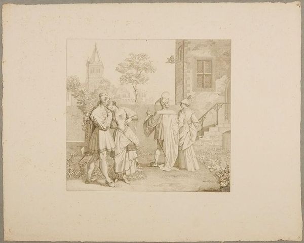 This is Pieter Tanjé’s etching, “Bruiloft van Cloris en Roosje,” made around 1730, held at the Rijksmuseum. Immediately, your eyes are drawn to the theatrical arrangement. An elevated stage to the left counterbalances the bustling crowd and the reader to the right, creating a dynamic visual rhythm. The composition here isn't just representational; it's deeply structured. The stage is set, quite literally, elevated to allow the viewer's eye to survey the scene. Note how Tanjé uses linear perspective to guide our gaze from the foreground's lively dance to the background's serene landscape, merging celebration with a broader sense of place. Observe the interplay of light and shadow. Tanjé masterfully uses it to define forms, creating depth and drawing attention to key figures, such as the wedding couple who are caught mid-dance. The artist uses the formal elements to construct a staged reality that invites us to consider the values and social rituals of the time. How might the arrangement challenge or reinforce established societal norms?