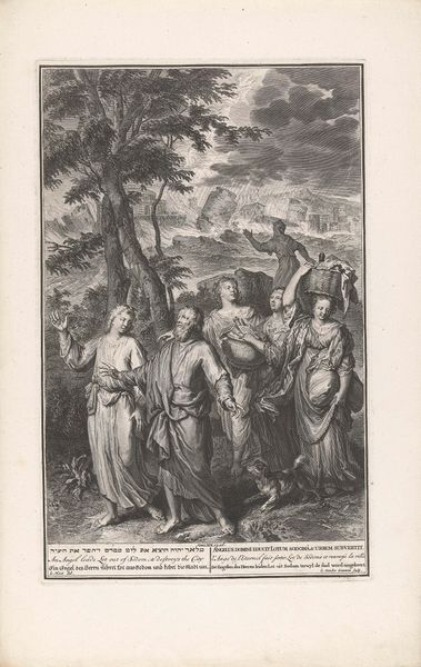 Curator: The Rijksmuseum holds this piece entitled "Lamentation of the Israelites," dating back to 1728. It’s an engraving by Gilliam van der Gouwen. What are your initial thoughts? Editor: It’s striking how dynamic it is, especially considering it's a print. The artist has created a swirling mass of figures. But is that tension, or just theatricality? Curator: Perhaps both. The dramatic poses certainly recall the Baroque style, but those gestures signify deep cultural grief, a collective mourning for Moses. The upraised hands are ancient Semitic gestures of mourning. Remember, Moses is not just a historical figure here, he's a foundational patriarch, a lawgiver. Editor: The formal repetition adds to the chaos. The engraver’s technique is quite refined. Notice how light is handled with the crosshatching, particularly on the figures’ drapery. Yet, this meticulousness also contains an agitation. See how the lines in the ground swirl and how that mountain seems almost animated by the texture? Curator: Precisely, it's not a simple illustration, it is history as collective memory. Look closer at the mountain in the background, and that small gathering. Doesn’t that tiny group by the peak, near what appears to be a small construction, give you a sense of the biblical exodus? It’s like a faded, shared past made real through iconic symbols. The foreground is an amplified reaction of deep sorrow, even despair. Editor: I see what you mean. Those symbols extend even to the architectural structure stage-left. It’s rigid and almost monumental despite it not even taking up a large portion of the frame, serving almost as a barrier for the crowd to huddle around. This isn't about capturing reality so much as conveying an intense, almost operatic emotion through a sophisticated manipulation of form and icon. Curator: An excellent point. And in Baroque art, isn’t that often the true subject—the dramatization of emotions through accessible iconography? Editor: Yes. It has been a really fascinating look at a print that feels so deeply alive. Curator: Indeed. Analyzing how different artistic styles engage cultural narratives reveals a wealth of artistic and historical understanding.
