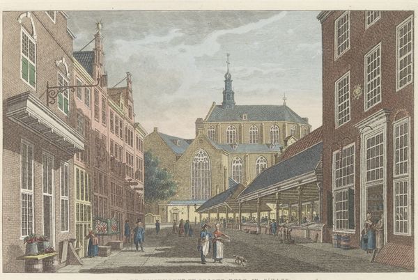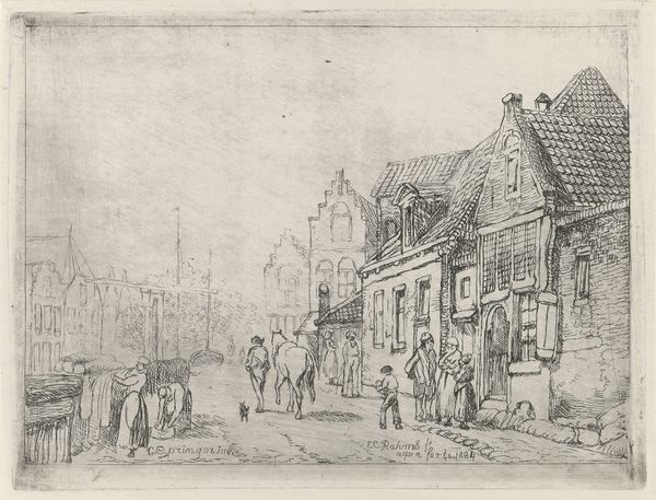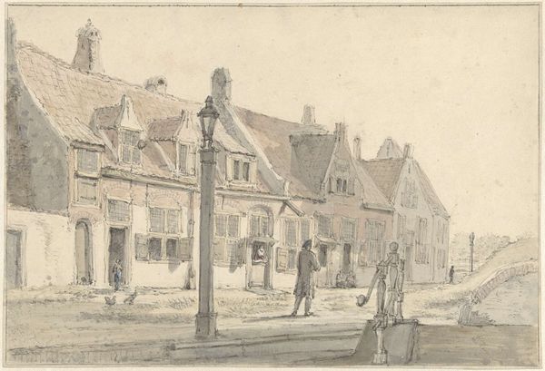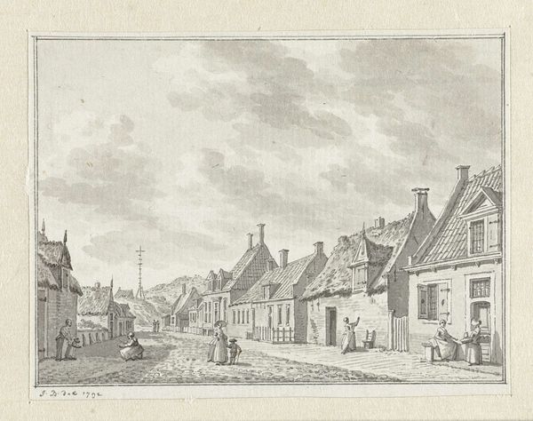 Jan de Beijer created this watercolor and pen drawing titled 'Gezicht in het dorp Harmelen,' now held at the Rijksmuseum. Notice how the composition leads your eye along the cobbled street, framed by buildings on either side, to the church tower at the center. The muted tones and the intricate linework evoke a sense of quiet observation. The drawing's structure reveals a careful balance between the architectural elements and the natural light. De Beijer uses linear perspective to create depth, drawing us into the scene. The repetition of the gabled roofs and window patterns creates a rhythm, while the variation in their heights and details prevents monotony. Consider the semiotic elements: the church tower, a clear signifier of community and faith; the figures engaged in daily activities; and the buildings themselves, each contributing to the overall narrative of a bustling village life. The use of watercolor, with its delicate washes and subtle gradations, serves to soften the scene, imbuing it with a sense of nostalgia and timelessness. This approach makes the artwork not just an aesthetic rendering, but also a reflection on the social and cultural values of its time.