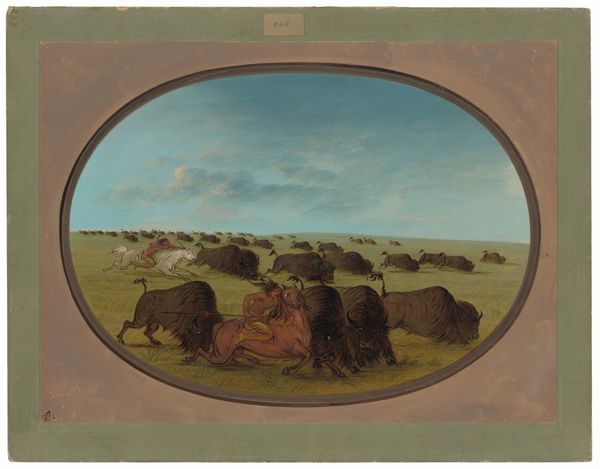 George Catlin created "Camanchee Horsemanship" using oil on canvas to capture a scene of dynamic movement. The oval composition, with its soft, muted palette of browns and greens, presents a panoramic vista of the Great Plains, creating a sense of expansive space. The painting skillfully balances horizontal and diagonal lines to convey both tranquility and action. Notice how the low horizon line and the broad, flat plain emphasize the vastness of the landscape, while the diagonal thrust of the charging horses introduces dynamism. Catlin's brushwork is loose and expressive, particularly in rendering the manes and tails of the horses, contributing to the overall feeling of energetic motion. The figures are rendered with careful attention to detail. The semiotic weight of the spears in the painting points to the cultural codes of bravery and skill associated with the Camanchee. The painting invites reflection on how the artist constructs meaning through form.