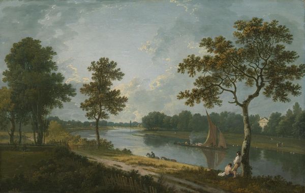 Curator: Looking at this idyllic scene, I'm immediately struck by how carefully the artist has built this space with these layers. It almost feels theatrical, like a stage set. Editor: Indeed. What you're responding to is the rococo influence, specifically, Jurriaan Andriessen's "Three wall hangings with a Dutch landscape," created in 1776. Andriessen was quite successful in blending the conventions of Dutch Golden Age landscape with the more ornate aesthetic preferences gaining popularity. Curator: Ah, yes, rococo, I can definitely see it now, but still, its scale and original intended purpose, the watercolor artwork almost reads as tapestry. What do we know about its making? Editor: He made this work using watercolors, a choice that really speaks to the airy lightness so characteristic of the time, in my opinion. The deliberate construction with these watercolors emphasizes a separation between the material world and its rendering, so that the scenes he pictures take on qualities that are at once hyper-real and impossibly dreamy. Curator: And what sort of world did Andriessen operate in? Because these riverbanks, these people, aren’t separate from social forces and conditions, they are intertwined. The figures by the water seem unaware or unconcerned by the viewer observing them. There's a class aspect here that's quite overt, do you agree? Editor: I agree that the figures shown embody certain characteristics—these aren’t working figures, nor aristocracy—but rather representations of rising merchant classes or land-owners. The way labor itself seems divorced from its visible products fascinates me; a great deal of attention and labour would have been given to this, in its original form as a textile mural, by unseen artisans and workers in textile production to manufacture tapestries, but this disappears to only display the work as artistic vision or ideal nature. It almost mirrors how colonial wealth benefited the elite class within Holland itself at that time. Curator: Yes, and those realities—the economic systems, the inequalities of access—directly shape who gets to enjoy the "natural" world presented, too, doesn't it? That idyllic vision is fundamentally bound to these power dynamics and I feel they should be challenged whenever engaging with art. Editor: Certainly, and that tension gives it all a subtle, but necessary complexity. I hadn't initially appreciated that tension until we unpacked the relationship here. Thank you. Curator: My pleasure, analyzing context helps create the necessary groundwork for seeing such realities.