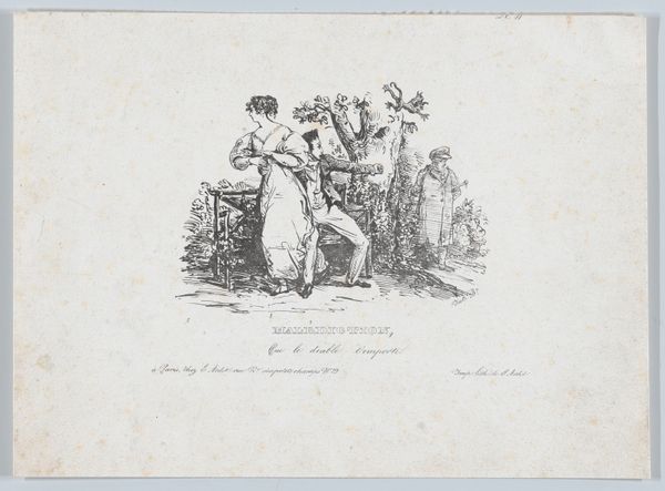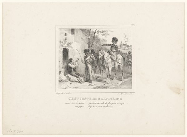 Editor: This lithograph, "Links soldaat bij marktvrouw, rechts Jean-Jean met grote zak over zijn schouder" by Auguste Raffet, made between 1825 and 1829, captures a bustling market scene with soldiers. It feels very dynamic and full of characters. What do you see in this piece? Curator: I see a convergence of archetypes, particularly poignant considering the historical context. The market woman, a universal symbol of nurture and sustenance, juxtaposed with the soldier, an archetype of order but also potential disruption. The Romantic style, with its focus on emotion, amplifies this tension. Editor: Tension? Where do you see that? Curator: Notice how the soldier’s presence affects the scene. Are they buying, or are they imposing? Jean-Jean, with his large sack, almost cowers, seemingly burdened by the implications of this encounter. Even the title—referring to the soldier 'next to' the market woman rather than engaging with her—suggests separation and unease. Does that separation resonate with any cultural memory for you? Editor: Well, now that you mention it, it does speak to that time period, just after the Napoleonic wars. Maybe a visual reminder of occupying forces. Curator: Precisely! Raffet uses these recognizable symbols – soldier, market, burdened civilian – to subtly comment on power dynamics and their lasting impact on the collective psyche. It’s a potent image, isn’t it? Editor: It really is. I didn't pick up on the power dynamic before, but it makes the scene so much more complex. Curator: Indeed, and it shows how visual symbols, even in a seemingly simple genre scene, can reveal layers of meaning rooted in history and cultural memory.