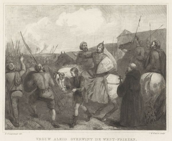 Curator: This print is called "Slag bij Castricum, 1799," which translates to "The Battle of Castricum, 1799." It was created between 1853 and 1861, by an anonymous artist, and you can find it here at the Rijksmuseum. It's an engraving that captures a moment of intense conflict. Editor: It's so dynamic! The chaos of battle practically jumps off the page, doesn't it? Even with the muted tones of the print, there’s a real sense of violence and struggle. I’m drawn to the central figures grappling near the horses. Curator: The Battle of Castricum was a significant event during the Anglo-Russian invasion of Holland, a campaign aimed at ousting French forces and reinstating the Stadtholder. What’s interesting is this print was produced decades after the actual battle, placing it within a broader 19th-century trend of Romantic Nationalism. These images often served to construct and reinforce national identity. Editor: Exactly, the "history painting" genre had a huge role to play in shaping national narratives, which often glorified particular sides and conveniently forgot or downplayed any complexities that contradicted their self-serving nationalist ambitions. You see this mythmaking even within the chosen aesthetic--Romanticism lends itself beautifully to stirring up emotion and idealizing conflict. Curator: Looking closer, notice how the artist balances realism and romanticism. The detailed uniforms and weaponry indicate attention to historical accuracy, yet the composition evokes drama and heroism. This juxtaposition highlights a need to represent history factually, but also with emotion, that's crucial to inspiring feelings of pride and belonging. Editor: Yes, and let’s think about the power dynamics. Who gets remembered as a hero, and who’s relegated to the background or entirely erased from these historical images? Whose perspective is being validated? This piece clearly favors a Dutch national view, casting them in a positive light during the battle, so, who is telling this story is something we must consider. Curator: Examining the role that artworks play in celebrating key moments, one can more deeply understand the shaping of national pride. The print immortalizes not just a battle, but a turning point in Dutch history. Editor: Absolutely, art such as this often functions as more than mere representations—it actively participates in how people come to understand themselves and their place within larger historical narratives. Curator: These works allow us to contextualize its time and culture while recognizing it can fuel or be used to challenge specific agendas. Editor: Exactly, engaging with art critically encourages a much wider awareness of representation.