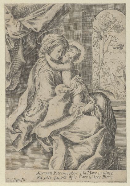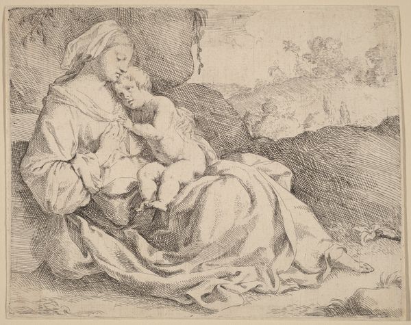 Editor: Here we have "The Holy Family with Saint Clare," a drawing and engraving created sometime between 1590 and 1600 by Guido Reni. I find it remarkable how Reni evokes so much tenderness with just lines. What catches your eye, what story does it tell you? Curator: Ah, yes, the etching! For me, it whispers of untold stories. Look at the delicacy, almost like capturing a fleeting thought on paper. It feels like peeking into an intimate moment, doesn't it? Like overhearing a sacred lullaby sung across centuries. Does Clare’s presence suggest something more to you? Editor: I see a gentleness, but her holding the chalice feels a little bit…foreboding? Curator: Foreboding... yes! It hints at the future sacrifice, a shadow play amidst the innocence. Consider Reni himself—a bit of a gambler, I’ve read, and yet obsessed with idealized beauty. A duality, like the light and shade in this print. Is that a visual relationship you pick up? Editor: It's faint, but yeah! Almost like two separate worlds happening in the same picture, right? What was his thought process, adding such seemingly small details to make a complex image? Curator: Exactly! The Italian Renaissance loved embedding subtle details. So in the light of later scholarship it’s likely Reni felt his art served both to show divinity and reflect an image to his patrons and even his own world, like a painterly mirror reflecting hopes, anxieties and desires! Editor: I didn't expect all those layers hiding beneath the surface. Curator: Isn't it wonderful? Every viewing offers a fresh conversation, just you, the artist, and centuries melting away, as they all stand…before Saint Clare!