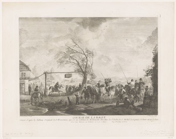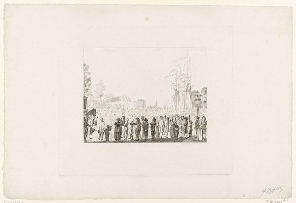 Reinier Vinkeles created this print titled "Aftocht van de Britten en Russen uit Den Helder, 1799" using etching. The composition draws the eye from the ships in the distance to the figures in the foreground, creating a sense of receding space. The buildings on the right act as a visual anchor. Vinkeles skillfully uses line and shading to define the forms of the people, ships and architecture. As a historical record, the print embodies the symbolic meaning of the event it depicts, the retreat of British and Russian forces. Vinkeles uses a semiotic system of signs through the detailed depiction of uniforms, flags, and the expressions on the faces of the figures. These visual components work together to create a narrative. The enduring interest in Vinkeles’ print lies not just in its historical value, but also in its formal qualities and how it reflects the intersection of artistic skill.