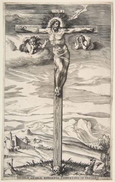 "Christ on the Cross" is an engraving made by Marcantonio Raimondi, a Renaissance artist, sometime between 1510 and 1520. Raimondi was instrumental in establishing printmaking as a means to disseminate art, allowing his works to reach a wider audience. The image depicts a nude Christ nailed to the cross, set against a mountainous landscape with a cloudy sky. Though small in scale, its emotional impact is significant, inviting viewers to contemplate the suffering and sacrifice of Christ. The choice to depict Christ nearly nude underscores his vulnerability, challenging the traditional glorification of religious figures. As you reflect on this engraving, consider how it speaks to the intersections of faith, representation, and the human body, inviting us to reflect on the personal and collective dimensions of faith.