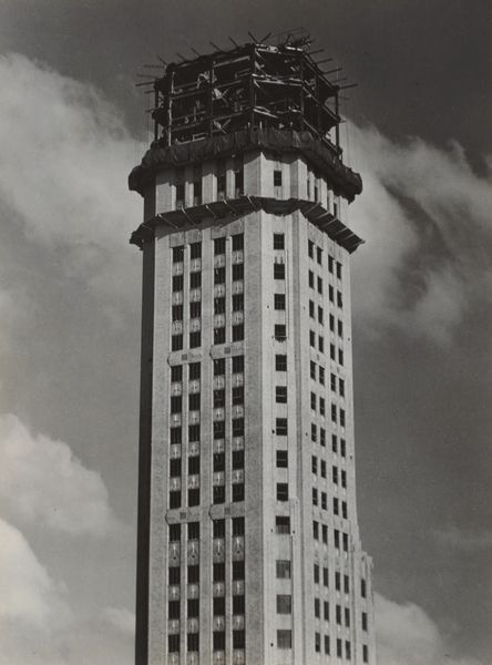 Alfred Stieglitz made this photograph, "From My Window at the Shelton, North" with a camera and film, fixing a specific point of view. The silvery grays, achieved through darkroom processes, give a tactile quality to the image, making the building almost sculptural. I’m drawn to the dynamic angle—a tilted view of the skyscraper. It's like Stieglitz is wrestling with the sheer scale and modernity of the building, not quite able to capture it straight-on. The unfinished top, with its skeletal framework, contrasts beautifully with the solid, finished floors below, which creates a tension. This image reminds me a bit of some of Charles Sheeler's architectural photographs, particularly in the way both artists find a kind of abstract beauty in industrial subjects. Yet, Stieglitz brings an emotionality and intimacy that feels unique. Art doesn't offer simple answers, but it invites us to keep looking and thinking.