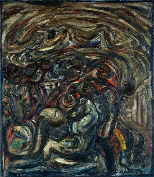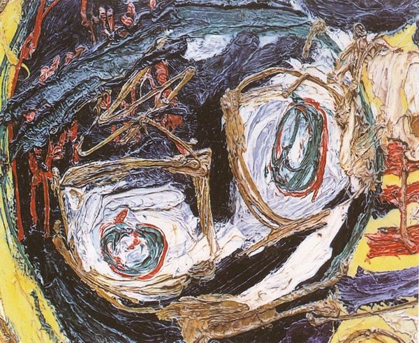 This untitled artwork was created by Kazuo Shiraga, and is a striking example of his unique approach to painting. Shiraga was a key member of the Gutai Art Association, a radical postwar Japanese art collective that sought to break free from traditional artistic conventions. Here, he has applied oil paint onto the canvas using his feet. The thick impasto and swirling lines capture the physicality of the artistic process. There is an emphasis on performance and action, transforming the act of painting into a kind of dance. Shiraga suspended himself above the canvas, using ropes or a trapeze to maneuver his body and apply the paint with his feet. By embracing such unconventional methods, Shiraga challenged the traditional role of the artist as a skilled craftsman. The artwork embodies the spirit of the Gutai movement, emphasizing the raw energy and materiality of the creative act. It invites us to reconsider the boundaries between painting, performance, and the body.