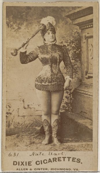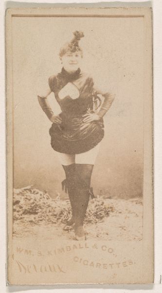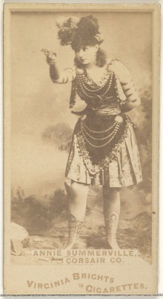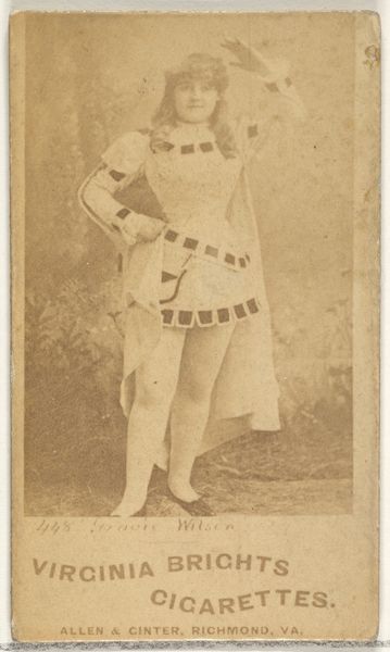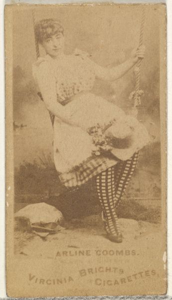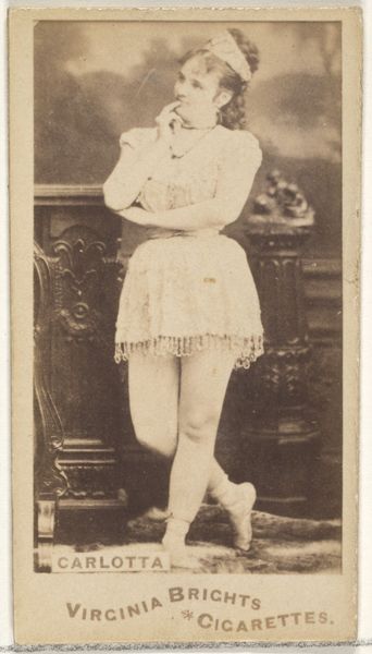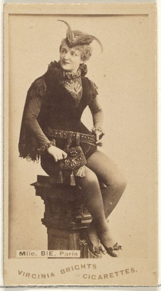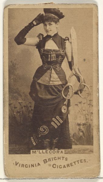 Curator: This is "Mlle. Andre, Paris," a c-print produced between 1885 and 1891 by Allen & Ginter, part of their "Actors and Actresses" series. It was actually an advertisement for Virginia Brights Cigarettes. Editor: My first thought is “charming, yet unsettling.” Her gaze is so direct. And is she in costume? Perhaps I'm reading the clothing as a symbolic representation of freedom or playful spirit? Curator: I find myself drawn to the texture of the paper itself and the means by which the image was reproduced for mass consumption. Look closely—this was printed on a card likely distributed with cigarette packs. It really democratized art access, in a way, blurring lines between advertisement and collectible portraiture. Editor: Yes! The photograph itself—beyond its promotional intent—creates its own layer of cultural encoding. Consider the circular prop. Its symbolism extends beyond a mere circus trick; circles often represent cycles, eternity, completion... even containment! Curator: Exactly. This relates to the materials too, I mean paper as a disposable commodity gaining archival value, especially once cigarette cards disappeared in general circulation. Did the average smoker even recognize these symbols? What value did it have to them, beyond something nice to look at for a minute? Editor: I'd argue it’s subconscious; we're wired to recognize such visual patterns. Her specific presentation adds depth to its cultural influence, suggesting femininity through costuming. Curator: True. It speaks to shifting views towards actresses, performances, and women in general. I mean the economic pressures of that period directly influenced who was documented, photographed, and remembered. It certainly emphasizes her celebrity and ties her likeness explicitly to the process of mass consumption and this form of very capitalist consumerism. Editor: Ultimately, this modest portrait is more complex than initial glances might indicate, bridging high-brow theatrical traditions and every day advertising in turn-of-the-century Paris. It's really evocative. Curator: For me, it throws into sharp relief our own entanglement in these systems of making and distributing and selling images, even today.