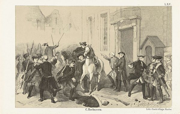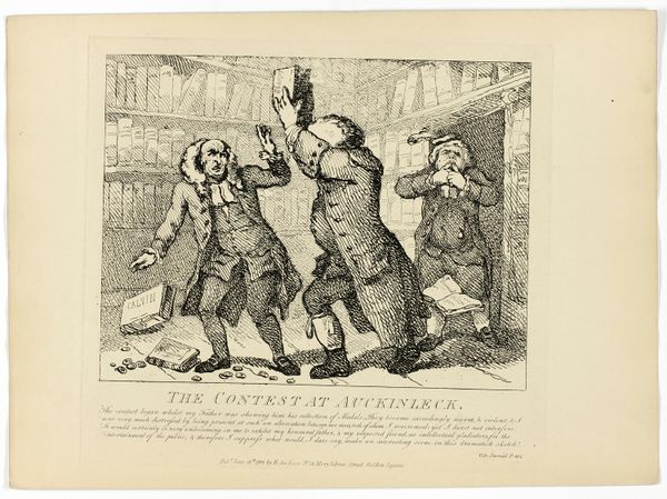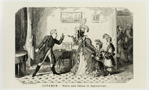 George Cruikshank created this steel etching, "July - Summary Proceedings," as part of The Comic Almanacks series between 1835 and 1853. The monochromatic scene, bustling with figures in a confined space, evokes a sense of chaotic energy. The composition is dense with detail, from the ornate decorations on the walls to the intricate patterns on the floor. Cruikshank uses line and shading to create depth. The characters are rendered with exaggerated features, emphasizing their emotional states and social roles. The central figure stands out as a focal point, gesturing emphatically while engaging with another character who appears to be resisting. Cruikshank's satirical approach, combined with his mastery of etching, highlights the social dynamics and power relations within the scene. The work can be seen as a commentary on the theatricality of social interactions. The artist destabilizes established meanings by presenting a chaotic vision that exposes the artifice inherent in social proceedings.