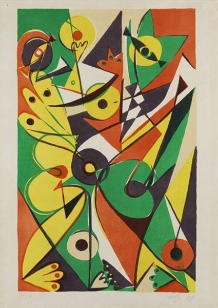 Editor: This is "Letter K (I Don't Know Fantastic Aventures Lacking the Howl of the Wolves)," a painting by Vasile Dobrian, rendered in acrylic paint. The geometric abstraction, with its hard edges and somewhat muted palette, feels very formal. What do you see in this piece? Curator: Formality, certainly. But I’m struck by the title, and how it clashes with that initial impression. It speaks to adventures unknown and the wild, untamed spirit of wolves, which are themes often linked to the dismantling of social norms. Could the letter ‘K’ itself be a symbol of something suppressed, a secret identity perhaps, struggling to find expression amidst geometric constraints? Editor: I hadn't considered the title in relation to identity. So, the geometric shapes aren’t just abstract forms? Curator: Perhaps they represent societal structures, limitations placed on individual expression. The red triangles feel particularly potent, disrupting the green and brown. Red often signifies passion, rebellion… do they disrupt the overall harmony or do they accentuate its imbalance? Editor: I see what you mean; they really stand out. Do you think the artist is commenting on the tension between conformity and individuality? Curator: It’s plausible. Dobrian may be exploring how social constructs—represented by the hard-edged geometry—attempt to contain our innate wildness, our “howl.” Art like this urges us to consider the cages, both visible and invisible, that shape our identities. What remains when all of these formal constraints are removed? Editor: That gives me a lot to think about. The contrast between the title and the visual rigidity really makes you question the story behind the image. Thanks. Curator: Indeed. And that questioning is precisely the point. Art should ignite dialogue and challenge our assumptions, encouraging us to howl a bit ourselves.
