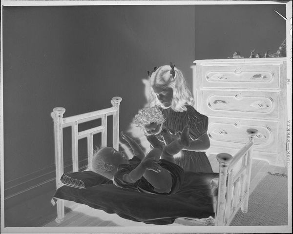 Curator: Today we’re looking at an intriguing gelatin silver print, approximately 4 by 5 inches, credited to Lucian and Mary Brown, and titled “Untitled (girl with doll in toy bed)”. Editor: It’s ghostly! The inverted tones give it a dreamlike quality, and there is a stillness to the scene. Curator: The photograph depicts a young girl carefully placing a doll in a small toy bed. It's hard to say when it was taken but it probably documents childhood and domesticity in a particular time and place. Editor: The doll bed itself is fascinating—the labor involved in creating such a detailed object for a child. It tells us something about the value placed on domestic play and the transmission of roles through material objects. Curator: Indeed. I wonder if the child's access to such toys reflects a certain social class, and what social roles were expected of her. Editor: It makes you ponder how the creation and consumption of even simple objects are tied to economics and cultural expectations. Curator: Precisely. It’s more than a snapshot; it's a window into the complex relationship between material culture and the human experience.