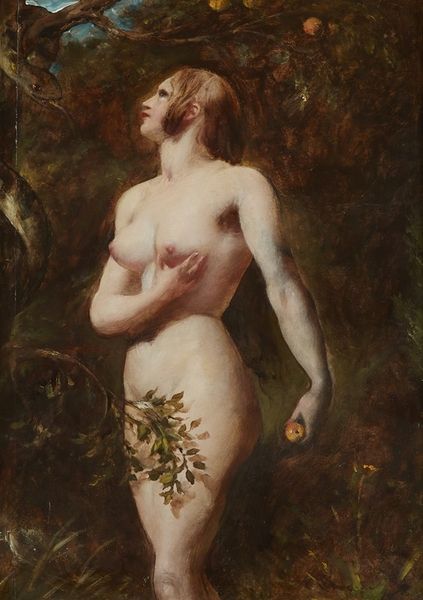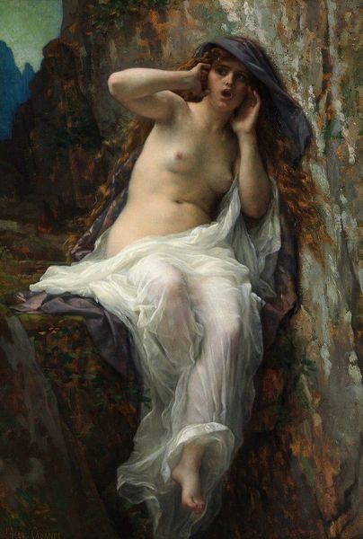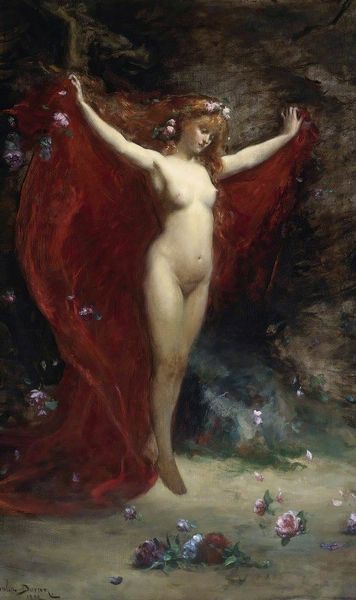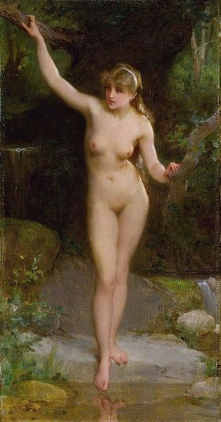 Ferdinand Leeke painted this oil on canvas, titled "Bacchantin," during a time of significant cultural interest in classical mythology. Leeke, working in late 19th and early 20th century Germany, invokes the figure of the Bacchante—a female follower of the Greek god of wine, Dionysus. These women were known for their ecstatic rituals and uninhibited behavior. We see here the depiction of the nude female form, a celebration of the female body rooted in classical idealism. The painting develops a narrative around female identity, desire, and freedom, framed within the visual language of the time, yet it also hints at the complex relationship between freedom, identity, and representation. The gaze and expression are what give this piece its real emotional and personal meaning.