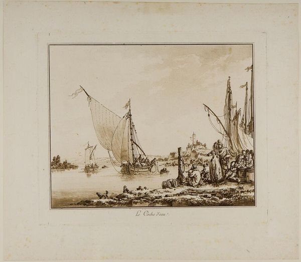 Curator: Before us is Johann Caspar Nepomuk Scheuren's "Plate XIV," currently held in the Harvard Art Museums. Editor: The starkness and the linear quality create a mood of quiet observation, wouldn't you say? Curator: Indeed. Notice how the artist uses the etched line to create a sense of depth, placing one boat behind the other, leading the viewer’s eye across the water. Editor: It certainly speaks to the era's colonial power dynamics— the figures standing with spears in the boat as a symbol of domination and control, surrounded by subordinates. It makes me wonder about the indigenous populations impacted by these voyages. Curator: Undoubtedly, we are presented with a narrative open to interpretation. The formal construction, with the horizon line cutting through the middle, provides a balanced symmetry to the composition. Editor: Absolutely, but also a powerful reminder that aesthetics are never neutral; they're always embedded in complex histories. Curator: Precisely, and by examining the formal elements alongside historical context, we achieve a fuller understanding of Scheuren’s work. Editor: It’s a testament to how art can reflect, but also mask, the socio-political currents of its time.