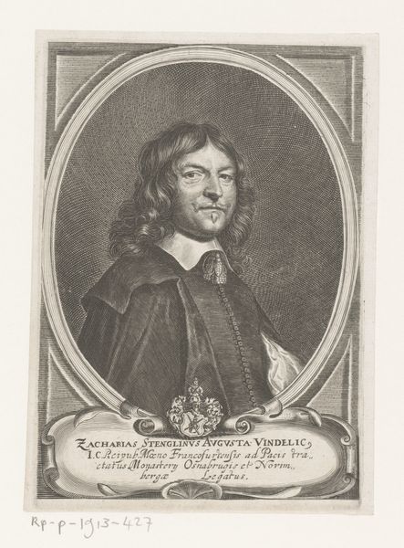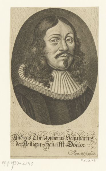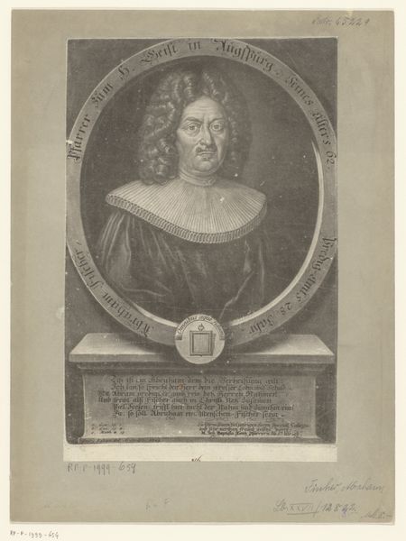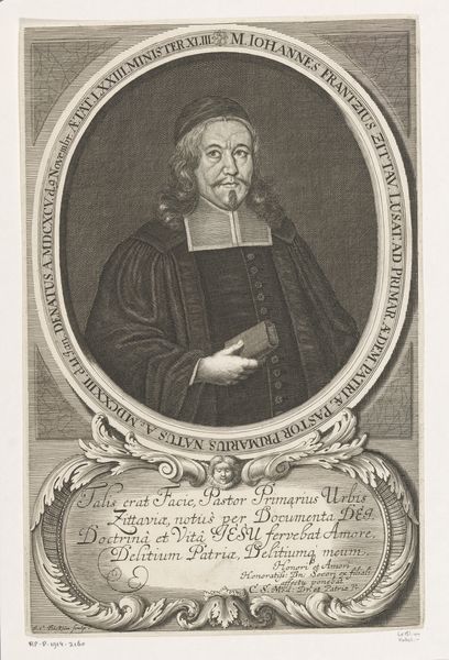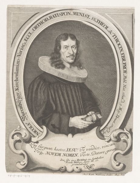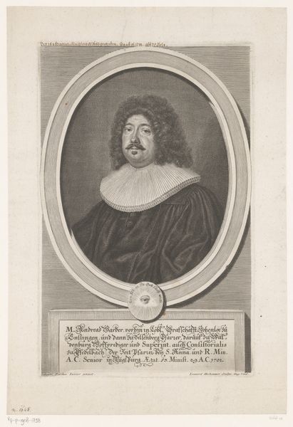This engraving is a portrait of Johann Ludwig Gombracht, created by Johann Alexander Böner in the 17th or 18th century. The piece encapsulates the complex relationship between religious identity, social status, and the power of representation during that era. Gombracht, framed within an ornate oval, is presented as a figure of authority and reverence. His attire, the book he holds, and the Latin inscriptions all serve to reinforce his identity as a respected theologian and member of the clergy. Böner, through his detailed rendering, not only captures Gombracht's likeness, but also communicates the sitter’s self-perception and societal role. Consider how religion played a central role in shaping individual and communal identities. Portraits like these were instrumental in constructing and perpetuating particular narratives about power, knowledge, and piety. They invite us to reflect on the ways in which historical figures are remembered, and question whose stories are told. The emotional resonance of this image lies in its careful construction of an identity, meant to inspire awe and respect.
