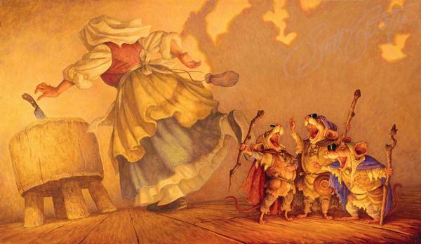 Scott Gustafson's painting presents a scene reminiscent of a timeless nursery rhyme, with a contemporary twist. At its heart is the motif of performance and entertainment, embodied by a cat dressed as a one-man band, complete with accordion, trumpet, and drum. The cat musician, a figure seemingly conjured from the depths of folklore, strikes a chord deep within our collective memory. This harks back to ancient traditions of animal musicians, figures who often symbolized both harmony and chaos. Think of medieval bestiaries or ancient Egyptian art, where animals often embodied human traits and conveyed complex symbolic meanings. The little girl's applause is a primal, immediate response to the spectacle before her. But, if we follow the pathways of cultural memory, the act of clapping reverberates with echoes of ritualistic gestures, of rhythmic synchronization meant to invoke spirits or celebrate communal bonds. This seemingly simple scene is, in essence, a microcosm of human interaction, reflecting our inherent desire for spectacle, performance, and the shared experience of joy.