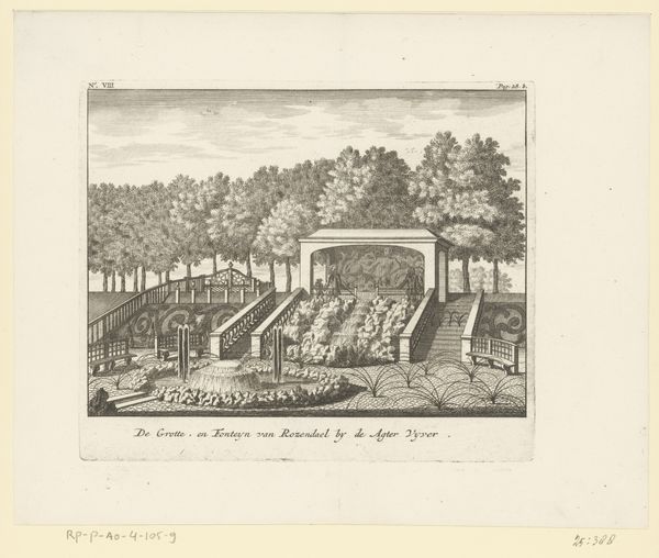 Editor: Here we have "Gezicht op de achtervijver van Kasteel Rosendael," or "View of the Fishpond Behind Rosendael Castle," an engraving by Jan (I) Smit from 1718. I’m immediately struck by the rigid formality of it all. It feels like peering into a meticulously designed dollhouse, or maybe a stage set. What do you see in this piece? Curator: Well, you've touched upon something key—the theatricality! For me, it's like catching a glimpse of a secret, manicured world. Baroque gardens weren’t just landscapes, they were statements of power and control over nature. Notice the strong lines, the almost mathematical precision... Do you get a sense of the artist's perspective, of where they’re positioned in relation to the scene? Editor: Yes, it looks like the view from inside a building, maybe even elevated. There’s this frame, an architectural element, around the garden view. Curator: Exactly! That frames the whole scene like a play. The building acting as the frame offers a voyeuristic look from "the cabinet near t' Huys" as written at the bottom of the print, creating a sense of distance and perhaps even detachment. And consider what’s included: regimented trees and manicured shrubbery that shows wealth, order and status. How does that formality resonate with you? Editor: I get that it’s about power, but it also feels a bit… suffocating? Like there's no room to breathe, to be wild. Everything is so controlled. It reminds me how social expectations used to impact human actions. Curator: Precisely! And I think it speaks to a tension we often find in art—this push and pull between freedom and order. So much can be learnt just by appreciating different techniques, it encourages imagination to thrive through curiosity. Editor: That tension is so evident. I am beginning to consider it differently now that I've had new perspectives of what is was once. Curator: Exactly, it's those second glances that can lead to great enlightenment.