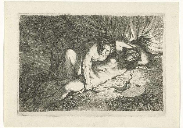 Curator: Here we have Henri Fantin-Latour’s "Silent Water" from 1903. This captivating image is rendered through lithography, etching, and printmaking, bringing forth a figure in a landscape. Editor: It feels both classical and eerie, almost dreamlike. The darkness pressing in around the reclining nude evokes a sense of vulnerability but also power. The stark contrast between the light and shadows is quite dramatic. Curator: Yes, the figure itself is bathed in light. The classical positioning reminds one of nymphs and water deities of earlier painting traditions. Yet, Fantin-Latour moves past a simplistic understanding by integrating elements of Romanticism. Think of the power of nature and the sublime. He taps into a visual vocabulary recognizable throughout Western art history. Editor: Absolutely. But it makes me consider this reclining nude in the broader context of art history where this pose is, let’s face it, loaded. So often, female nudes are positioned for the male gaze. However, this nude appears oblivious, in her own dream space, maybe escaping society's expectations. It hints at reclaiming autonomy within traditional narratives. Curator: A compelling point. Her enclosed and silent nature emphasizes her withdrawal from external concerns. Perhaps it speaks to a universal yearning for inner peace. The dark thickets act as more than simple background scenery. They shield her and, simultaneously, make her a focal point. Editor: I agree; and by obscuring specific details with shadows, the artist amplifies an allegorical representation—making space to re-imagine the woman's narrative beyond objectification, a radical concept in its own right during the time. Curator: Considering his other, much brighter still lifes and floral works, this somber figuration is particularly poignant, echoing symbols of death and the underworld. Editor: Indeed, the image prompts an investigation beyond conventional visual interpretation and encourages contemplation of female presence within shifting landscapes of culture and psyche. The "silent water" might just reflect hidden strengths and quiet rebellions. Curator: It invites a conversation beyond pure aesthetics, touching on social and philosophical perspectives through an artistic lens. Editor: Exactly, revealing art’s unique position at the intersection of representation and potential for reshaping understanding.