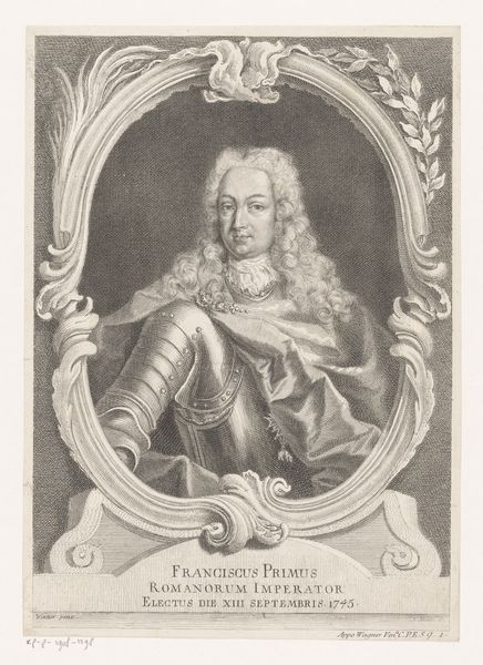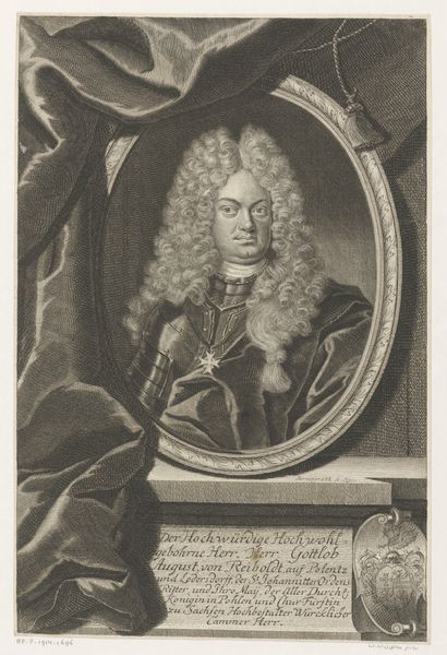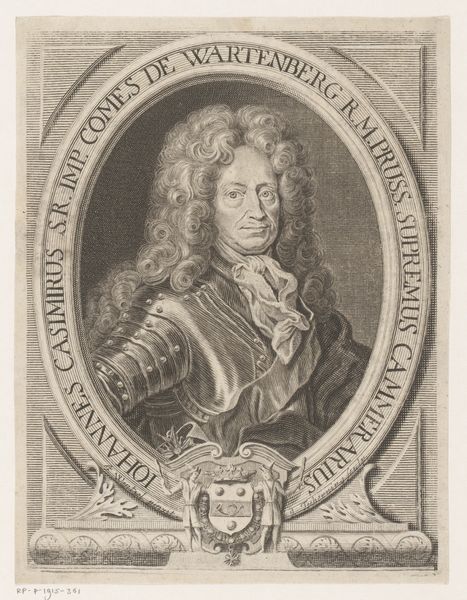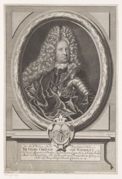 This is a portrait of Carl Ludwig, Freiherr von Wildenstein, made with etching and engraving by Georg Lichtensteger, who died in 1781. Such images were vital for the consolidation of power in the 17th and 18th centuries. Here, Carl Ludwig is encased in an oval frame, with an inscription that speaks to his titles and connections to the ruling house of Brandenburg-Culmbach, in what is now Germany. Note how the subject is presented in armor, a visual code that links him to military strength. Portraits like this weren't simply neutral likenesses; they were tools used by the elite to broadcast their status and legitimacy. They reinforced the rigid social hierarchy of the time. Further research into the Wildenstein family and their role within the political landscape of Brandenburg-Culmbach would reveal more about how this image functioned.