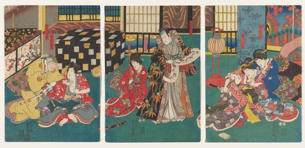 This woodblock print, ‘Hoofdstuk 9’, was created by Utagawa Kunisada, who died in 1865, and is currently held in the Rijksmuseum. The work features a vibrant palette with a compositional arrangement that invites the viewer into a scene of poised anticipation. The foreground's horizontal lines create a sense of groundedness that contrasts with the verticality of the sliding doors. Kunisada orchestrates a visual tension between the static figures on the left and the central figure who stands in a moment of performative presence. Semiotically, this work plays with codes of Japanese art, where form dictates content. The precise lines and flat planes of color serve not just to depict, but to construct an image of Japanese culture. Notice how Kunisada's formal choices elevate this print beyond a mere representation of people. The emphasis on line, color and composition underscores the artwork's status as a cultural artifact, one which continues to invite interpretation.