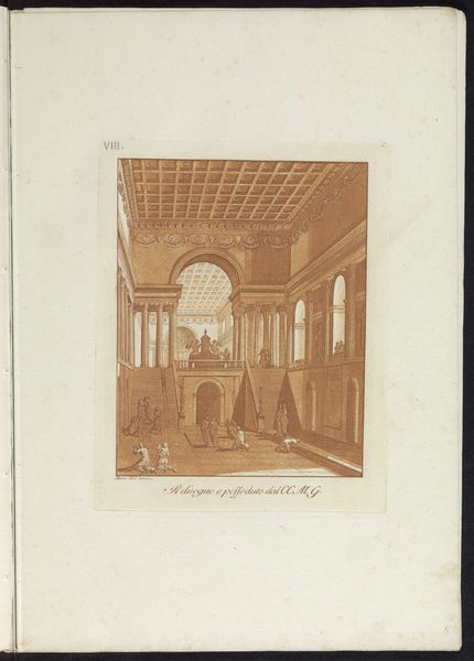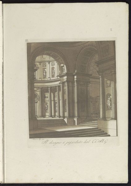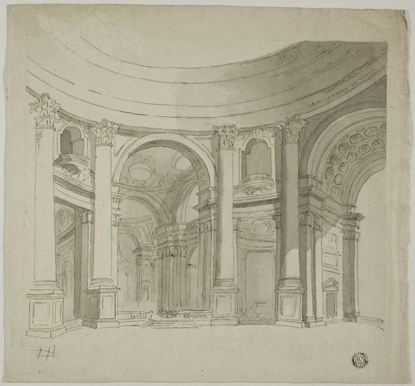 Cesare Massimiliano Gini created this drawing, 'Interior with a Domed Ceiling', using pen and brown ink with brush and grey wash. Gini captures a mesmerizing architectural space. The eye is drawn through a series of arches and columns that recede into the distance, creating a profound sense of depth and perspective. The dome, intricately detailed with a lattice pattern, crowns the space, adding a layer of complexity. The use of brown ink and grey wash gives the drawing a monochromatic palette, emphasizing light and shadow to define the architectural forms. The meticulous detailing in the columns and arches suggests an interest in classical forms. The arches act as frames, each opening revealing a further extension of the interior, hinting at infinite space. Ultimately, the success of Gini’s drawing lies in its ability to balance the formal elements of architecture with a sense of infinite space. It is a testament to the power of drawing as a medium for exploring the complexities of space and perspective.