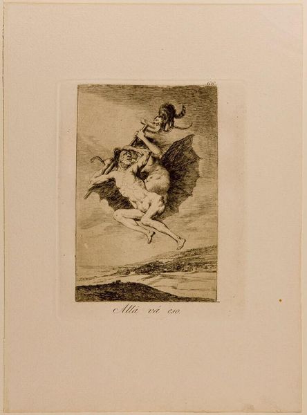 Curator: Let’s turn our attention to Goya’s print, “Bravissimo!,” held here at the Harvard Art Museums. Editor: The stark etching, with its grotesque figures and unsettling composition, feels like a dark dream. What's happening here? Curator: Goya is known for his satirical commentary on Spanish society. Here, a monkey serenades a donkey, while others applaud. Editor: The tonal gradations are masterful; see how the crosshatching defines the forms. It's visually unsettling. Curator: It's thought that the monkey represents artists performing for an unappreciative, asinine audience—perhaps a jab at the art world and its patrons. The image serves as a critique of ignorance and misplaced praise. Editor: The way Goya uses aquatint to create shadows is almost like a stage, highlighting the absurdity. Curator: Goya often explored political and social themes through satire. In “Bravissimo!,” his critique of the social elite is unmistakable. Editor: Yes, the technical skill enhances the disturbing narrative. A compelling piece overall.