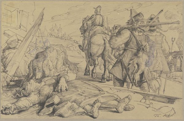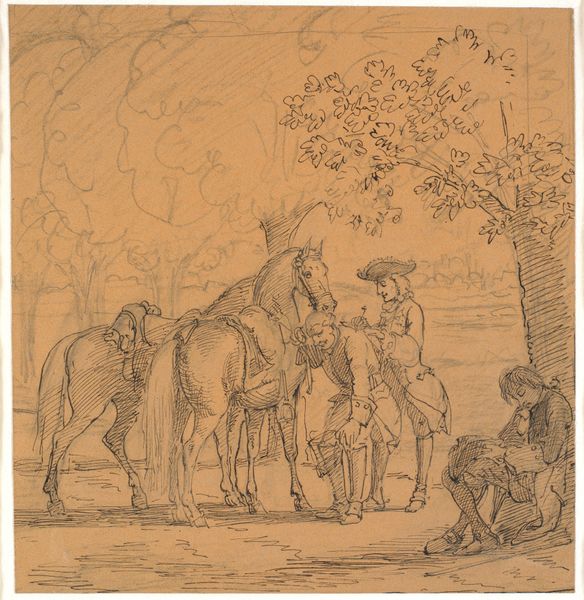 Curator: It feels so still. All the motion held just for a moment. It’s an ink drawing of light dragoons, soldiers on horseback, pausing to let their mounts drink. Editor: This piece by Willem Constantijn Staring, entitled "Lichte Dragonders die paarden laten drinken op de rust," translates to 'Light Dragoons Letting Horses Drink at Rest.' Created around 1830, it captures a moment during a time of considerable social and political upheaval in Europe. Curator: It's funny how that translates, it seems to lose some of the beauty and feeling, some of the restfulness I felt. Do you think the dragoons felt it too? Editor: Absolutely. Rest was crucial for maintaining morale and operational effectiveness. Think about the power dynamics inherent in this tableau – the dragoons, instruments of power, temporarily dependent on nature's provision for their horses. It hints at the ecological costs of militarization and territorial control. Curator: Ecological costs is not something I’d considered with an 1830 ink drawing! I was simply reflecting on how deftly Staring uses line weight. The trees dissolve in the background, whereas the horse in the front and center almost walks right out of the image toward us. Editor: Exactly! The precision in rendering the horses—these animals weren't merely modes of transport; they were partners. Their care reflected on the soldiers' values. Beyond the tactical details, there's this suggestion of comradeship and shared vulnerability within a potentially brutal military system. The landscape becomes a liminal space where tensions simmer, and nature itself is implicated. Curator: Comradeship and vulnerability captured in a series of skillfully rendered lines. You know, thinking about all this has given me a different lens to consider my daily pauses with my pup at the park. Editor: It goes to show, doesn’t it? These artworks, ostensibly historical or pastoral, become sites of powerful reflections on enduring struggles—access to resources, societal inequalities, and the environment that sustains us all. Curator: Exactly! Thanks for sharing your view of this drawing and the period that produced it. I am heading out to feed my cats, thinking of those horses… Editor: Thank you; I will reflect on the implications of every future stroll I take near the canal!