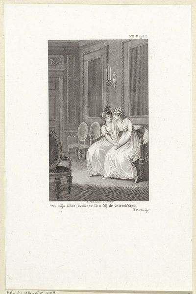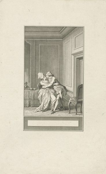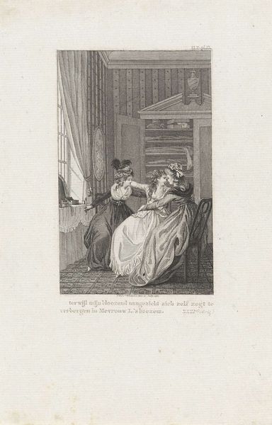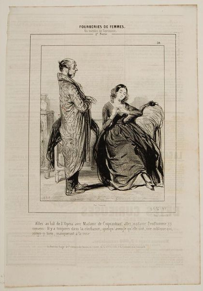 Editor: This print by Paul Gavarni, titled "Hang it! Mr. Montmirail, you're strapping down my stateliness!", is fascinating. The composition is so dynamic, with the woman’s pose contrasting the man's effort. What are your thoughts on the linear elements at play here? Curator: Indeed, the strategic use of line defines the forms and creates a sense of depth. Note how the artist utilizes hatching and cross-hatching to create areas of shadow and volume, particularly in the drapery of the gown. Consider also how the stark contrast between the dark lines and the blank paper contributes to the overall sense of drama. The frame within a frame also accentuates the artificiality of the scene, does it not? Editor: It certainly does. I hadn't considered the interior frame so much. I see how the artist guides the viewer’s eye. Thank you for expanding my understanding of the piece. Curator: My pleasure. These formal elements coalesce to convey a potent narrative, a testament to Gavarni's mastery.