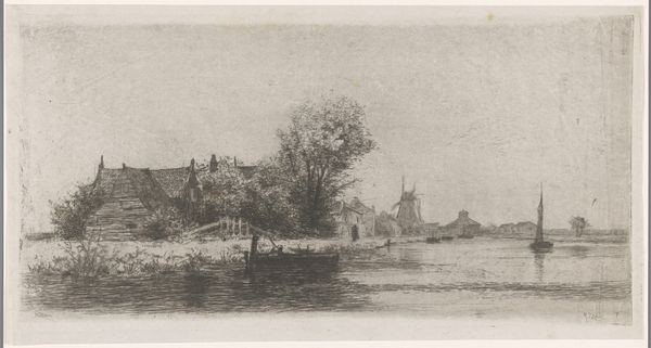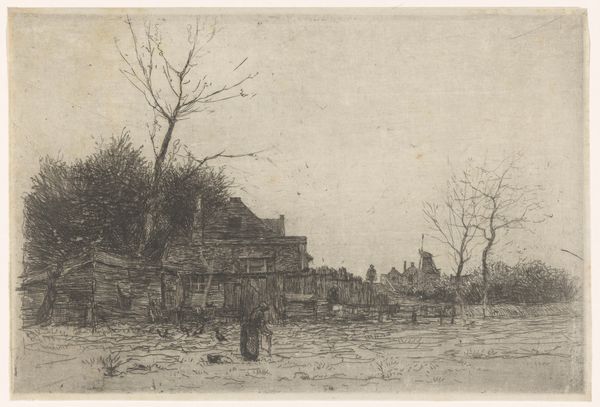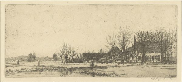 Willem Adrianus Grondhout made this etching called 'Sloot in de Binckhorst in Den Haag', though we don't know exactly when. Look how the lines are used to suggest depth and texture, like the scratchy, bare trees in the foreground against the buildings further back. It's like he's feeling his way through the scene, line by line. The etching is full of subtle details. The contrast between the rough textures of the foreground and the more refined shapes of the buildings creates a kind of visual tension, doesn't it? And there's a real physicality to those lines; you can almost feel the artist's hand moving across the plate. I am drawn to the marks in the bottom left of the page, the subtle shading that gives way to blank space. I wonder what kind of tool he used to achieve that level of nuance. There's something about Grondhout's way of seeing that reminds me of Whistler, in how he captures a sense of atmosphere and mood with such economy of means. It's a reminder that art is always in conversation with itself, echoing and reinventing ideas across time.