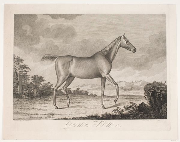 Meno Haas made this engraving, "Hesten 'Turcmainatti'," which translates to "The Horse 'Turkmen'," presumably in Denmark, sometime around the late 18th or early 19th century. Here, Haas presents us not just with an image of a horse, but a portrait of status and power in the Age of Enlightenment. The Turkmen horse breed was prized for its speed and endurance, qualities highly valued by the aristocracy for transportation, sport, and warfare. The horse is meticulously rendered, its muscular build and elegant stance showcased against a backdrop of cultivated fields and distant hills, implying land ownership. Prints like these circulated among a wealthy elite, reinforcing a culture of admiration for bloodlines and landed gentry. By understanding the historical context, we can better interpret the image not merely as a depiction of an animal, but as a reflection of the social hierarchies and values of its time. Researching stud books, agricultural practices, and even estate records, might tell us more.