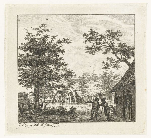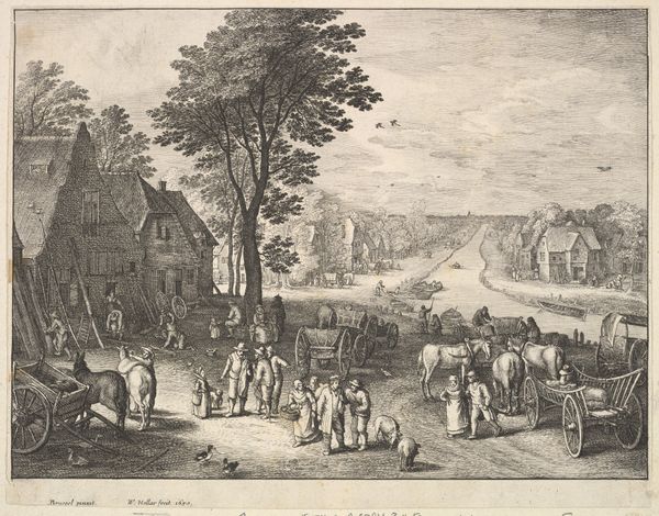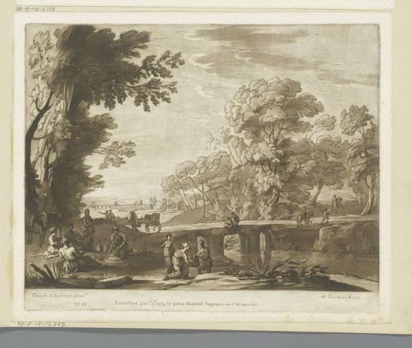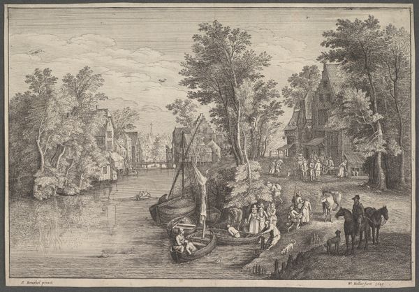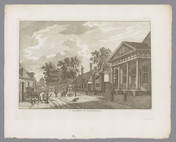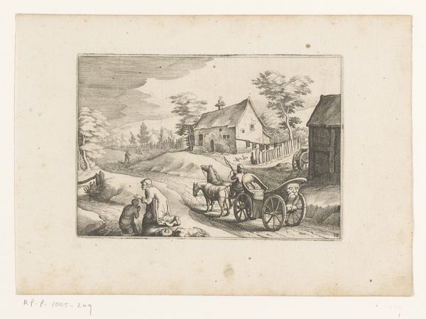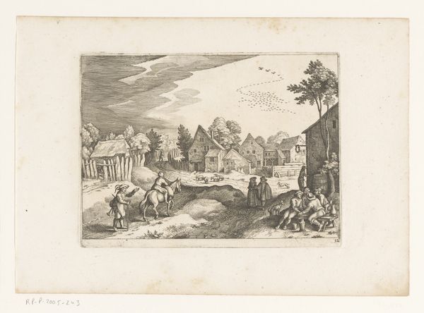 Editor: So, this is *Weg tussen Honselaarsdijk en Wateringen*, or *Road between Honselaarsdijk and Wateringen*, an engraving by Cornelis Danckerts II. It was likely made sometime between 1696 and 1774. It feels like a slice of 18th-century life, everyone on their way somewhere. What captures your attention about this piece? Curator: What immediately strikes me is the emphasis on infrastructure and civic order. The meticulous depiction of the road, bridge, and buildings isn't just aesthetic; it speaks to the burgeoning importance of trade and transportation networks in Dutch society at the time. What kind of narrative do you think this print aims to convey about Dutch society? Editor: Perhaps a sense of prosperity and connection? I mean, it looks like there are travelers, maybe merchants. It projects this idea of a society on the move. Curator: Precisely. This image is likely not just documenting a landscape, but subtly reinforcing a particular vision of Dutch power and progress. How does the composition contribute to that reading? Think about where the artist places the emphasis. Editor: The road is the focus; it guides your eye into the city! The architecture and the figures add detail but they don't detract from the main theme. Curator: Exactly! Furthermore, consider where these prints were displayed, and for whom they were intended. Understanding their function helps unlock their political and social meaning. These kinds of landscapes gained popularity and it's interesting to consider who consumed them. Editor: That's fascinating! I was initially drawn to the detail, but I see how it portrays the era's priorities of civic life, infrastructure, and, you're right, progress. Curator: Indeed, looking closer reveals a rich, nuanced history beyond the immediate visual appeal. Thinking about the social function and who the prints were intended for changes my perspective quite a lot.