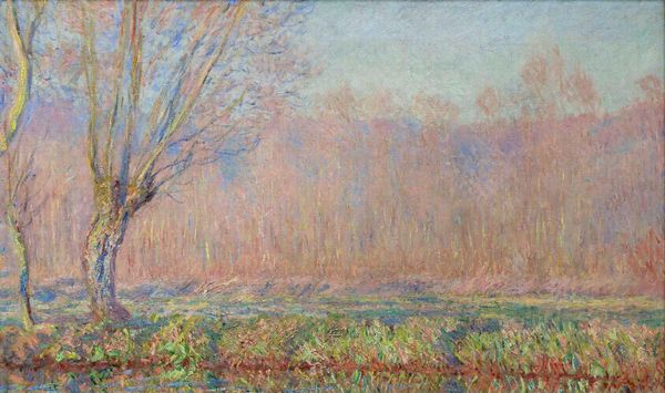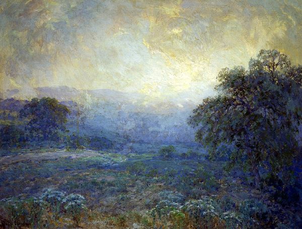 Editor: Here we have "Tamarisk Trees in Early Sunlight" by Rose O’Neill, a landscape done in oil paint. The trees look as if they are dancing! It really brings an air of joyful tranquility. What stands out to you when you view this painting? Curator: I immediately notice the interplay between the impressionistic style and the potential commentary on land use. Considering the materials - oil paint applied en plein air - where might O’Neill have sourced these materials? Were they locally produced, speaking to a localized economy, or mass-produced, reflecting larger industrial networks? The method itself represents labor. What kind of physical effort did O’Neill invest in creating this? Editor: That’s a really interesting perspective. I was just admiring the dreamy light! I hadn’t considered the… logistics, I guess, of getting the paint and canvas. Did that kind of material consideration play a big role for artists at that time? Curator: Absolutely. The availability and cost of materials dictated artistic choices, sometimes reinforcing class structures in art. Someone’s access to pigments speaks to their socio-economic status. Here, though, the brushstrokes are quick, efficient… suggesting a consciousness of time and material usage. This makes me question if O’Neill’s depiction of nature is actually intertwined with reflections on industrial processes and resource management? Editor: That’s a lot to take in. I would not have ever have thought that looking at the art materials can say so much about economics and even the artist’s labor itself! Curator: Exactly! By examining these elements, we gain a deeper appreciation.