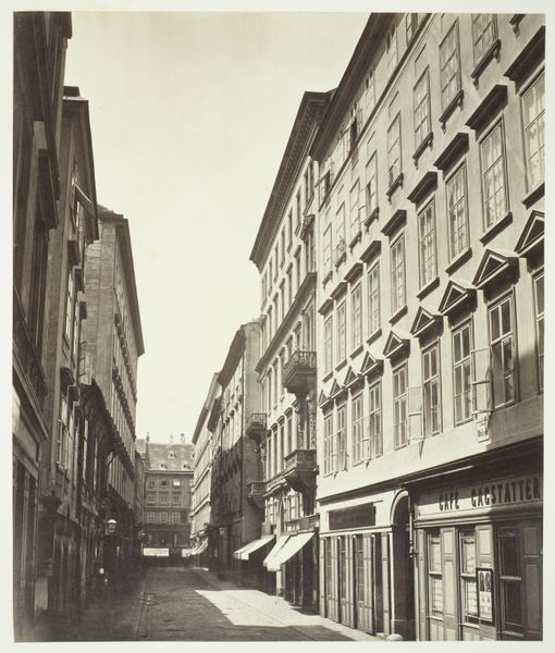 This photograph, Jägerzeile No. 39, Wohnhaus des Herrn Stef. Mayerhofer, captures a street in Vienna with great clarity, showcasing the architecture of the time. Although the photographer is anonymous, we can still consider the materials and processes involved in its making. The photographic process itself is crucial to understanding this image. It involves a complex sequence of chemical reactions, light exposure, and development techniques to transfer the image from the lens onto the coated paper. The tones of the photo and the sharpness of the image speak to the photographer's technical skill. The even lighting and static composition suggest a deliberate and careful approach to capture the architectural details. The photograph also serves as a social document, capturing a moment in time. The buildings' facades, the street scenes, and even the blurry figures of people walking by provide a glimpse into the urban environment and the daily lives of the people who lived and worked there. Thinking about the materiality and making of photographs encourages us to appreciate them not just as images, but as documents created through specific processes that reflect the conditions of their time.