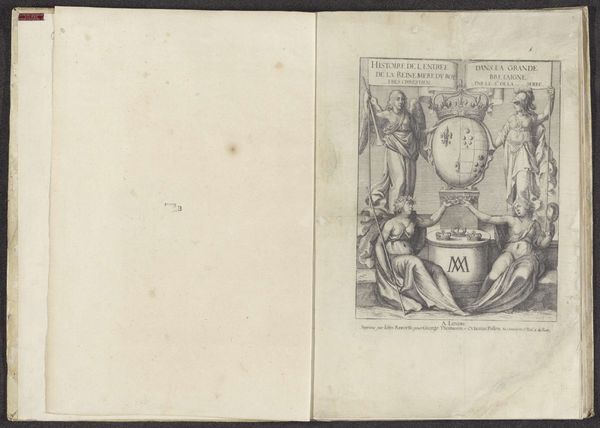 Curator: This image is the title page, "Verscheyden Lantschapjes," by Willem Pietersz. Buytewech, currently residing at the Harvard Art Museums. Editor: It's a rather small etching, but the composition feels so lively! There's an exuberance in the figures despite the somber monochromatic palette. Curator: Buytewech, though he died young, was crucial in developing Dutch genre art. This title page, though for landscapes, presents us with figures that speak volumes. The two figures flank a cartouche filled with text. Editor: I see them as representing different societal roles, perhaps contrasting lifestyles. One is elegantly poised, while the other is much more active. This arrangement creates a sense of balance, doesn't it? Like two sides of a coin. Curator: Indeed. The symbolism here touches upon the duality of human nature and the visual language of status within Dutch society at the time. It is like a prelude to the varying landscapes that will follow in the book. Editor: Thinking about it, this piece highlights how even seemingly simple images can be powerful carriers of culture and collective memory, reflecting the times in which they were created. It’s a testament to the power of visual storytelling.