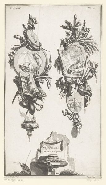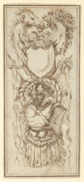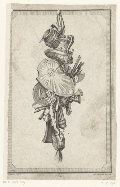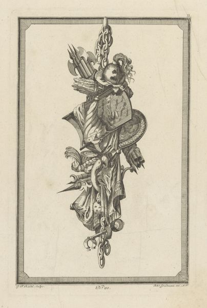This etching of a trophy with shield and headdress was created by Gottlieb Friedrich Riedel in the 18th century. Observe how the collection of arms and armor, including the shield, helmets, and weapons, are not merely objects, but potent symbols of military might and honor. Consider the recurring motif of the trophy throughout history—from ancient Roman triumphal arches adorned with spoils of war to Renaissance paintings celebrating victorious heroes. The shield, prominently displayed, evokes the protective aspect of warfare. Throughout history, shields have been adorned with symbols, emblems, and heraldic devices intended to instill fear in enemies and signify the identity and allegiance of the bearer. These motifs act as visual cues, engaging us on a primal level and eliciting feelings of awe and reverence. The non-linear, cyclical progression of these symbols is clear. They resurface, evolve, and take on new meanings in different historical contexts, reflecting our collective fascination with conquest, legacy, and power.