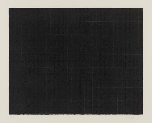 Editor: We’re looking at a 1974 print by Michael Goldberg. It's an untitled linocut print on paper. What strikes me most is the delicate repetition of these almost invisible lines. What can you tell me about it? Curator: The subtlety you observe is key. Goldberg, though associated with Abstract Expressionism, here engages with a quieter, almost minimalist aesthetic. What institutional forces might have encouraged such experimentation with abstraction and the linocut print medium? Remember, by the 1970s, there's already a reaction to the grand gestures of the Abstract Expressionists and a turn towards more accessible mediums, partly influenced by the rise of Pop Art. Editor: So, he’s intentionally moving away from that big, bold style? Curator: Possibly. Consider also the politics of imagery at the time. A starkly different approach to abstraction had emerged, less overtly expressive. Could this almost imperceptible mark-making reflect a cultural shift? Was Goldberg questioning what mark making meant for public viewership at the time? What meaning can the viewer create through their experience with this type of visual language? Editor: It’s interesting how something so seemingly simple could be tied to broader shifts in art and society. I had never considered that. Curator: Indeed. Goldberg uses the artistic practices available to him to enter the social dialogues being discussed through art. The linocut as a form has it's own history, often utilized to connect a graphic or message for easier viewing. He moves towards abstraction, creating an interesting space. Editor: Thanks, seeing it as part of this bigger picture makes it far more interesting than I first thought. Curator: I’m glad. Always ask yourself how an artwork is not just reflecting but actively shaping its cultural moment.