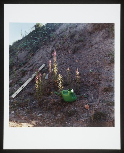 Curator: This is Keith Arnatt’s photograph, "Miss Grace's Lane," part of the Tate collection. It captures a seemingly mundane scene, a grassy verge bordering a lane. Editor: It feels melancholic, almost like a forgotten memory. The abandoned red net nestled amongst the tall grass is particularly striking. Curator: Arnatt's work often explores the unnoticed corners of life, elevating the everyday into something worthy of contemplation. He's interested in how we perceive these spaces. Editor: The red net disrupts the natural palette. Perhaps Arnatt is commenting on our intrusive impact on the landscape, how even a child's game leaves its mark? Curator: It could be. Or perhaps it's a marker of absence, hinting at stories untold within these overlooked environments, inviting us to reconsider how we value place. Editor: I'm left pondering the relationship between childhood, memory, and the often-forgotten spaces that shape us. Curator: It’s a photograph that invites quiet reflection, a subtle yet powerful commentary on the poetics of the ordinary.