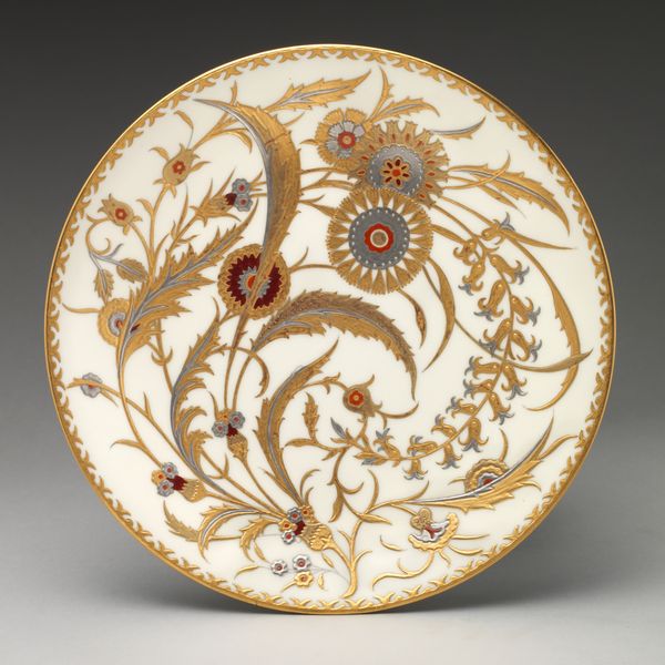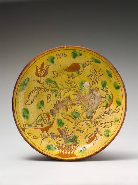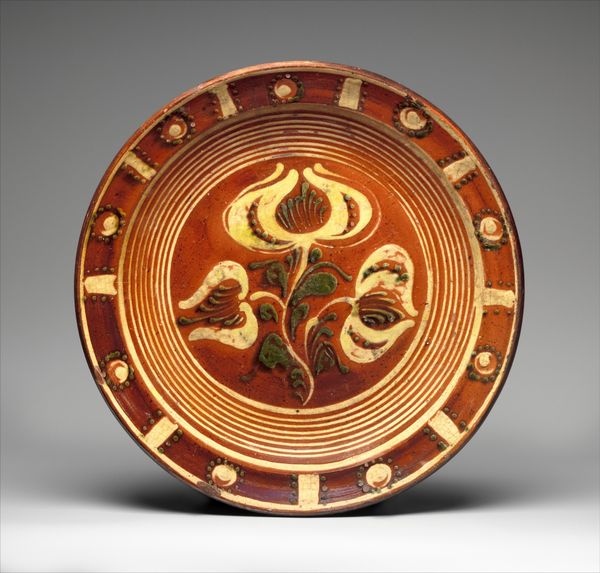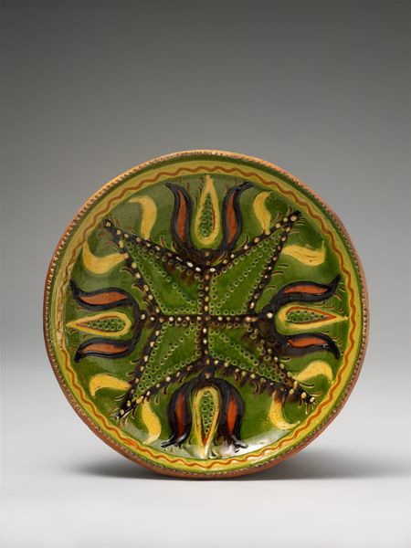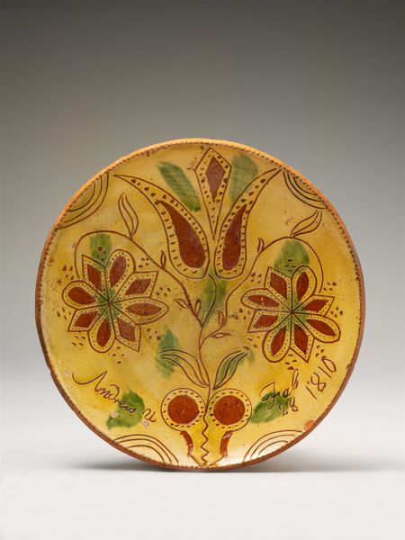 Editor: So, this is an earthenware plate from 1830, attributed to John Monday. The colorful, folk-art design really jumps out – it’s charming! The painted flowers give it a lively feel, despite being on a rather humble material. What do you make of it? Curator: This piece exemplifies the democratization of art through readily available materials and the labor of artisans. The ceramic, while functional, is elevated through its painted decoration, blurring the lines between craft and fine art. Consider the social context: was this mass produced, or uniquely hand-painted? Editor: I see. It definitely looks hand-painted, you can see the individual brushstrokes, particularly in the flower details. And, you’re right, was this something affordable available to a large portion of the population, or something commissioned and a marker of status? Curator: Precisely! The choice of earthenware, the painting style—all point to the economic realities of the time. We should consider where John Monday was based, what trade networks he had access to, and how these materials shaped his artistic expression. Editor: It’s amazing how much we can glean from simply considering the materials and production process. I’d never thought about decorative objects like this in terms of labor before. Curator: These “simple” objects often hold more complex histories related to skill, access, and social value than more celebrated artworks. Editor: This plate really makes you think about art existing outside of museums and galleries. Everyday life aesthetics, like folk art, tell a unique story. Curator: Exactly, art within the reach of everyone, shaping lives and culture on an everyday scale. Thinking materially truly grounds art within history.