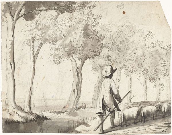 Curator: This is "Three Shepherd Boys with Sheep by Willows," a drawing dating to around 1653 by Harmen ter Borch, currently held in the Rijksmuseum. What are your first thoughts? Editor: Stark. Bleak, almost. The limited use of ink lends a sense of quiet austerity to this rural scene. It feels like an observation, quickly captured. Curator: Ter Borch was fascinated by representing scenes of everyday life. Notice how the willows are sketched in a very specific way. For centuries, the willow has been tied to notions of mourning, adaptability, and even magic. Their presence here gives the seemingly simple subject deeper resonance. Editor: It’s interesting to consider what 'simple' meant then. Ter Borch likely had a sophisticated understanding of ink production; the subtle tonal variations here testify to the processing techniques and possible combinations of oak gall, iron sulfate, and gum arabic used. These weren't tubes readily available at the shop! Curator: Indeed. The choice of subject matter reflects shifts in artistic patronage during the Dutch Golden Age, from religious iconography toward more domestic themes that a burgeoning merchant class might purchase. One could suggest these shepherds signify simpler, purer ways of living in counterpoint to the increasingly complex social stratifications in Dutch society. Editor: I’m curious about the physical process. Ter Borch likely used a quill, perhaps goose or swan, and judging from the evenness of the lines, a well-prepared batch of ink. The cost and effort involved certainly informed what types of imagery became normalized. Art materials are rarely neutral carriers of cultural values. Curator: Very true. Also note that the hats worn by these youthful shepherds perhaps acted as emblems of their social status, and afforded a measure of protection, and might have further symbolic weight beyond simple utility. Headwear has, across eras, denoted specific identities. Editor: The hats definitely stand out. I imagine ter Borch capturing these boys on paper after observing them in the fields, recording details of their labor—the herding, shepherding—documenting rural life with accessible, affordable materials. This places us at the start of the transition where new material conditions allow a proliferation of artists exploring everday existence. Curator: Looking closely allows us to appreciate the work in fresh ways. This unassuming sketch truly illuminates the interconnected realms of symbolism and material circumstance within Dutch society. Editor: It certainly does! We can explore broader questions of production, craft, and even economics through such an understated piece of art.