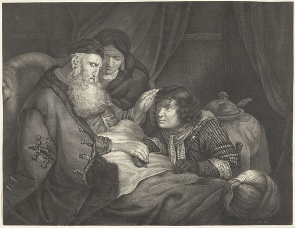 Carel Lodewijk Dake created this print titled 'Isaäk zegent Jacob', sometime before his death in 1918. Dake was working during a period when the Dutch art world was deeply engaged with themes of national identity and historical narratives. Here, Dake illustrates a scene from the Old Testament, steeped in themes of deception and familial conflict. Isaac, old and blind, is tricked by Jacob into giving him the blessing meant for his brother Esau. Notice how the dim lighting and close quarters intensify the drama. The narrative raises questions about identity, as Jacob disguises himself to steal his brother’s birthright. It's a story loaded with emotional tension, reflecting the complexities of family dynamics, ambition, and the lengths to which people will go to alter their destinies. Dake's print invites reflection on the intersection of faith, identity, and the fraught relationships that shape individual lives and cultural histories. It reveals the subtle ways that power, passed down through generations, is often a site of struggle and manipulation.