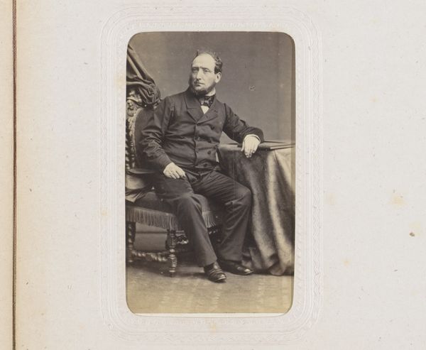 Editor: So, here we have a gelatin-silver print from around 1866, attributed to Jacob Hohmann. It’s a portrait, formally titled "Portret van een man staand bij een stoel, aangeduid als Ringers" - that translates to, "Portrait of a man standing by a chair, referred to as Ringers." My first impression is…stately. Maybe even a little melancholic? What do you see? Curator: Melancholic is a wonderful way to put it! I feel that too. But look closer, doesn’t it also strike you as… theatrical? The way he leans, the ornately carved chair – almost like a prop. And it really speaks to how photography, still quite novel then, was consciously mimicking the visual language of painting and theater to legitimise itself as an art form. It's not *just* a photograph, it's a performance, a construction. Makes you wonder, doesn’t it, who *is* Ringers? Editor: It does make me wonder! It feels like he’s trying to project an image of himself. Curator: Exactly! And the greyscale! Consider the almost unbearable limitations the lack of colour imposed upon the photographer - yet see the textures! The felt of the jacket, the dull gleam of his hair! What *couldn't* be, enhances what *is*. Editor: That's fascinating; I hadn't thought about the colour limitations as an enhancement, only as a limit! The textures really do jump out. It's funny how constraints can spark creativity, isn’t it? Curator: It's almost *always* the case. Every limitation holds a universe of freedom, when perceived the right way. A wonderful opportunity for us all, if you ask me! Editor: Absolutely, seeing this photo with your perspective has shifted how I look at early photography! Curator: And seeing it with your eyes makes *me* reflect anew on the magic in it. Always so rewarding!