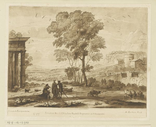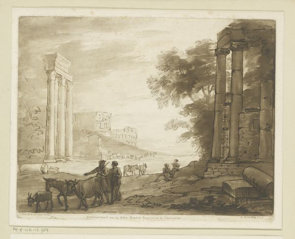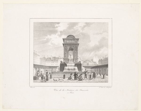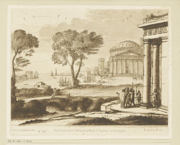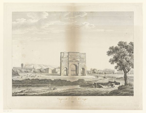 Curator: Looking at this piece, the most obvious element is this peculiar blend of ambition and melancholy, isn't it? Editor: It certainly catches the eye! Let me orient our listeners. Here we have a drawing, with print elements, of a planned triumphal memorial designed by Thomas Harrison, meant to commemorate King George IV's visit to Wales in 1821. The piece dates from around 1817 to 1827 and is called "A Plan of a Triumphal Memorial... at Holyhead." It depicts the memorial situated on the pier, with a lighthouse in the distance. Curator: Right, the proposed construction feels imposing, Romanesque, yet the subdued greyscale and the empty vista impart a sense of something lost before it began. I wonder about the availability of Portland stone at this remote location and whether this memorial would ever function in its historical and economic reality. Editor: Exactly! It makes one ponder about intended purposes and what really matters to us. What remains after grand gestures fail to materialize? Did it ever get built? Was there a supply disruption, or was there not sufficient capital for it to be built? Curator: Fascinating questions! Given the level of detail in this preparatory drawing by Augostino Aglio, the elder, one assumes there was considerable initial investment of human resources—planning, surveying, artistic labor—which now exists almost as a ghost of intention. Editor: Almost a landscape of wishful thinking made tangible, haunting in its own way. I’m reminded of how easily the weight of aspirations can be reduced to lines on paper, or the physical and social barriers preventing large ideas being developed, particularly in an era defined by material exploitation. And beyond the king and the architect, what would such a structure have meant to the everyday folks in Holyhead? What do you think they needed from a big idea? Curator: Those are important considerations, highlighting the often-unseen hands that shaped the potential building's historical meaning—or, in this case, its historical absence. A powerful commentary indeed. Editor: I completely agree! A potent and sad representation of power, labour, and how they might combine or clash to result in beautiful futility.