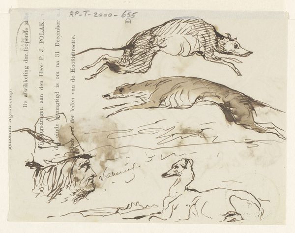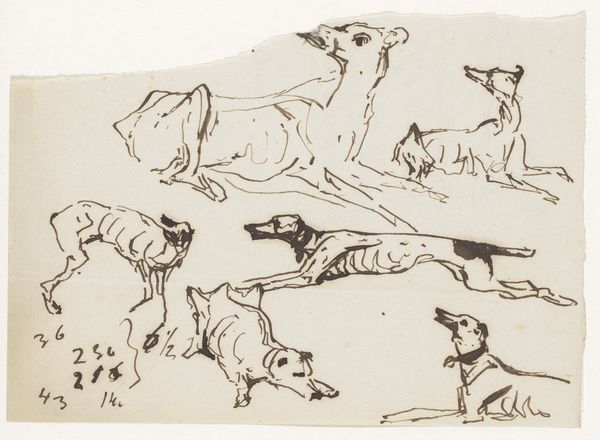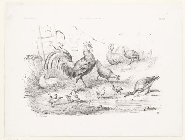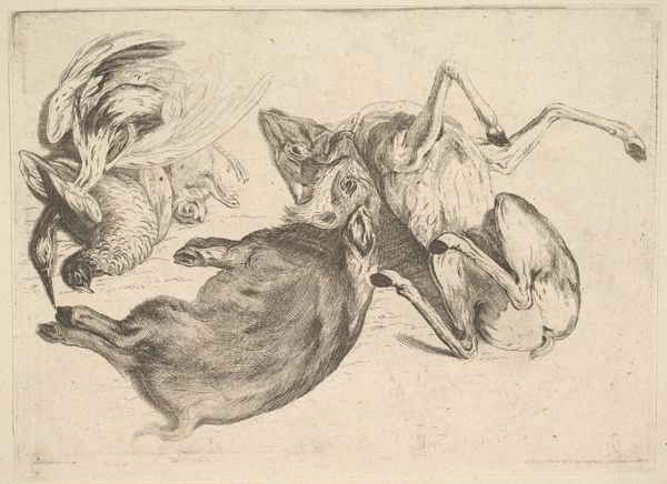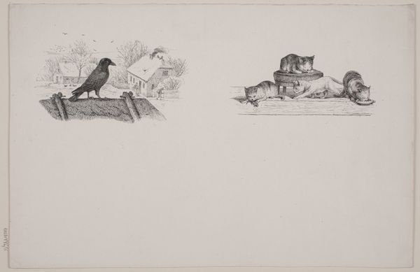 Curator: At first glance, it strikes me as an almost idyllic, quiet scene, rendered in such delicate detail. Editor: Indeed. We’re looking at "Billede 9" by Lorenz Frølich, created around 1838. It's an engraving, using ink on paper, currently held at the SMK, the National Gallery of Denmark. Curator: What I love is the intimacy, that kind of peaceful tableau of animal symbiosis. But, looking closer, is there a bit of tension beneath the surface? A kind of standoff with some sort of crowlike avian creatures seemingly bullying a sleeping dog. I feel the dog symbolizes, innocence. Is there a predator prey dynamic at play, as a counterpoint? Editor: Precisely. This drawing presents a multitude of symbols associated with our complicated relationship with the natural world. Birds have long symbolized freedom, messengers from the heavens, while the dog, often seen as loyal, represents domesticity, grounding and perhaps a degree of naivete. The crow, often a harbinger of death, contrasts greatly. Curator: Do you get a sense of precarity with that dark contrast? Is the landscape itself almost immaterial or neutral ground—nothing there really anchors them except the ink, you know? And perhaps what connects is, dare I say, our projected emotions, as they take shape? Editor: The negative space amplifies this. Frølich's use of sparse ink strokes invites our imagination to fill in the story. One could even read the dog's vulnerability, combined with the birds pecking and perched nearby, as memento mori - a meditation on mortality. Even in slumber, life is threatened. But there could be also an alternate narrative of simple communion or cohabitation in the picture, but that depends mostly in the viewer! Curator: It all boils down to tension—the stillness feels pregnant with possibility, with conflicting interpretations fighting for dominance. Editor: Absolutely, and through its deceptive simplicity, it continues to evoke powerful cultural associations and deeper personal contemplation about these things, what an evocative and beautiful work to consider these ideas.