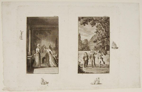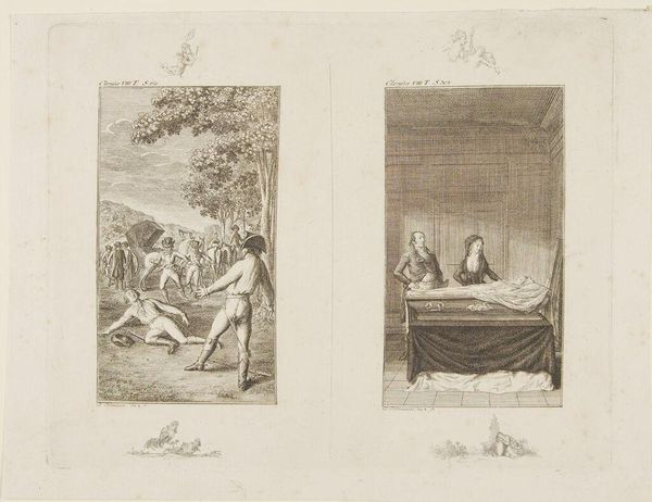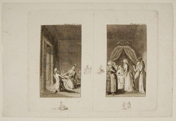 Curator: This engraving by Daniel Chodowiecki, "Two Scenes from 'Clarissa'," presents a pair of domestic interiors teeming with drama. Editor: The stark contrast between these adjacent images is immediately striking; one radiates supplication, the other despair. Curator: Indeed. The image on the left depicts a woman kneeling before another, perhaps seeking forgiveness, while on the right, a figure stands shrouded as another lies prostrate nearby. Editor: The semiotics of shame and power are palpable, aren’t they? The kneeling posture implies subjugation, echoing gendered power dynamics still relevant today. Curator: The curtained beds and shrouded figures suggest concealed truths, echoing the psychological weight of secrets within families, a theme that resonates across generations. Editor: I can’t help but view the artwork's narrative within a broader discourse of class, gender, and societal expectations. Who dictates the terms of such scenes? Curator: And how do these scenes, frozen in time, influence our present understanding of moral narratives? Editor: It's a testament to Chodowiecki's ability to capture such potent human drama within these intimate engravings. Curator: Indeed, the images provoke reflections on how historical narratives continue to shape our current social constructs.