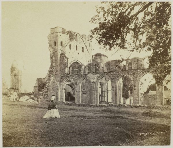 Editor: So, this gelatin silver print is called "Ruïne van Raglan Castle te Monmouthshire," taken by Francis Bedford sometime before 1862. The crumbling architecture has such a melancholic feel, don't you think? What stands out to you when you look at it? Curator: The ruin, cloaked in ivy, whispers of time's relentless march. Do you see how the natural world embraces the man-made, almost reclaiming it? It evokes a potent symbol, one loaded with cultural memory, really, particularly in Victorian England. Editor: A symbol of what, exactly? Curator: Transience, certainly. But also the Romantic fascination with the past, with nature's power to overcome even the grandest of human creations. The ruin, so artfully composed by Bedford, becomes a meditation on mortality, decline, and the sublime force of nature. Even that figure sitting in the doorway, almost disappears, like a ghost. Editor: So the castle isn't just a backdrop. It’s more like… a reminder? A symbolic representation of bigger ideas? Curator: Precisely. Photography, at this time, sought to capture not just surface reality but deeper, emotional truths. The ruin carries echoes of bygone eras, reminding us of lost glories and inevitable decay, a visual *memento mori.* Editor: I never considered photography in that light before. It makes you wonder what symbols we're building into images today, even without realizing it. Curator: Indeed. We all participate in encoding images, often unconsciously, with the emotional, cultural, and psychological weight of our own time. Seeing it expressed so beautifully here helps unlock that process.