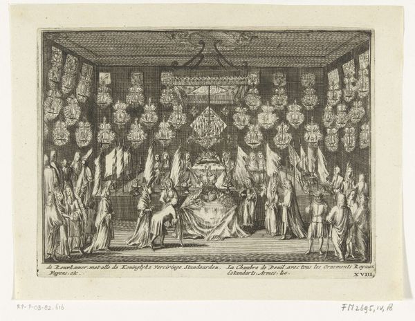 Here is the audio guide script: Jan Punt created "Schouwburg met toneeldecor: Zonnehof," using etching. The artwork presents a detailed interior view of a theater, dominated by an elaborate stage design and audience. The symmetry and precise lines lend a formal, almost architectural quality to the scene. Punt's rendering of the stage creates a space within a space, an illusion designed to transport the viewer. The classical columns and statues flanking the stage, together with the cloud-filled backdrop, establish a dialogue between real and ideal, stagecraft and nature. This contrast draws attention to the constructed nature of theatrical experience, inviting consideration of how stage settings shape our perception. The formal composition suggests a structured social order reflected in the clear separation of stage and audience. The etched lines, precise and deliberate, serve not just as a means of representation but as a commentary on the act of viewing itself, reminding us that art is always mediated, constructed, and open to interpretation.