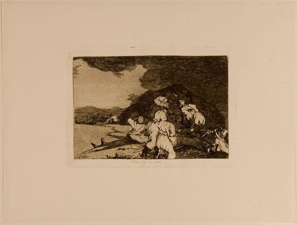 Editor: This is "There is No One to Help Them" by Francisco Goya. It's an etching, and the scene depicted feels incredibly bleak. What stands out to you in its composition? Curator: The stark contrasts of light and shadow articulate the emotional intensity. Notice how the darkest areas delineate the figures, emphasizing their forms while simultaneously obscuring their identities. The diagonal lines create a dynamic, unstable composition. Editor: The instability definitely adds to the feeling of unease. Curator: Indeed. Consider how the aquatint technique contributes to the overall mood. The subtle gradations create a sense of depth and texture, amplifying the visual impact. What do you make of the posture of the central figure? Editor: They seem to be caught between despair and defiance. It's the only figure standing, so it draws the eye. I hadn't considered the aquatint technique until you mentioned it! Curator: These elements, considered together, imbue the print with its unsettling power, prompting us to reflect on the human condition. Editor: I see that now. Thank you!