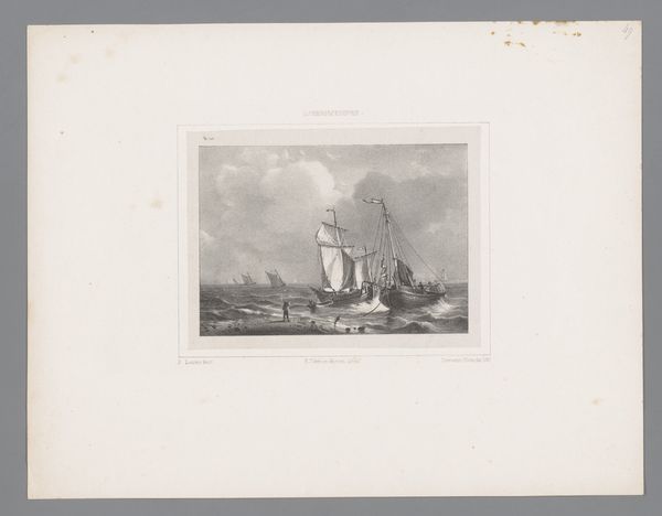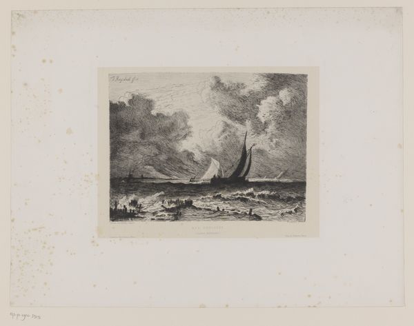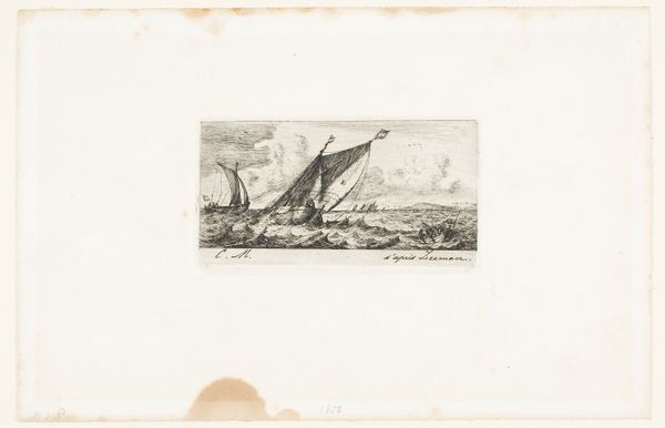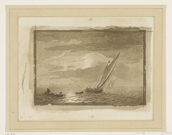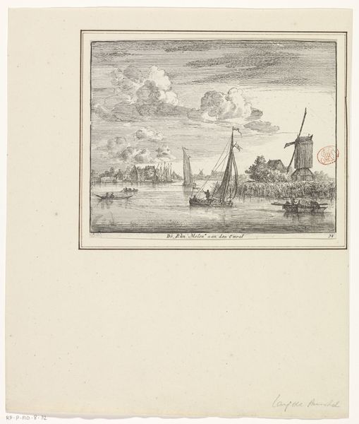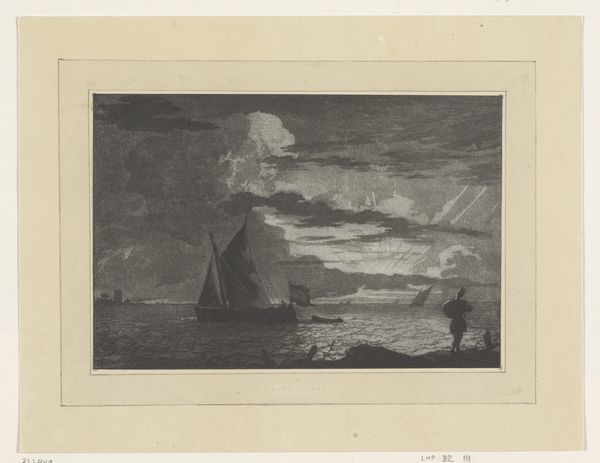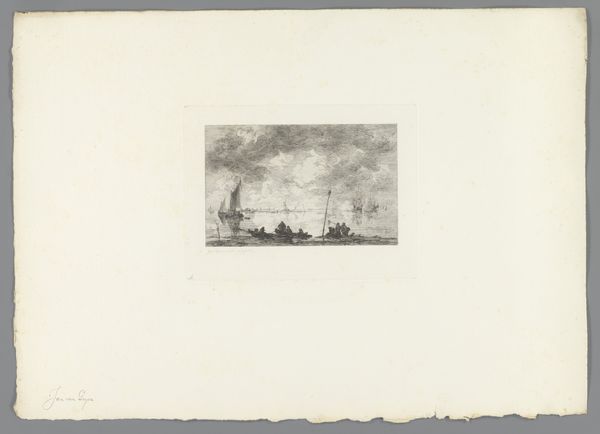 This is Hermanus van Brussel's etching of Spakenburg, a Dutch fishing village, captured in monochrome tones. Van Brussel lived through the Batavian Republic and later the Napoleonic Kingdom of Holland, a time of political and social upheaval that influenced the art world deeply. The etching presents a seemingly serene coastal view, but look closer: the high contrast and dark tones evoke a sense of foreboding. This wasn't merely a landscape piece; it was created during an era of profound national identity crises. The fishing village of Spakenburg becomes a stand-in, an emblem of Dutch resilience, where the sea, both a resource and a threat, shapes the lives of its inhabitants. The artwork isn't just a depiction of a place; it reflects a society grappling with its identity and future. The emotional weight is palpable—it’s in the somber sky and the stark contrast of light and shadow. It invites you to contemplate the interplay between nature, human existence, and the socio-political forces that shape them.