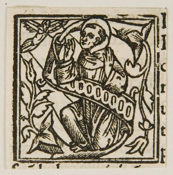 Curator: Here we have Hans Holbein the Younger’s “Letter V” from Harvard Art Museums. Editor: It has a stark, almost primitive quality, doesn’t it? The thick lines of the woodcut give it a tactile feel. Curator: Holbein was deeply embedded in the social and political upheaval of the Reformation. This initial "V," featuring an elder, resonates with themes of wisdom and tradition. Editor: And the method! A woodcut demands direct engagement. Carving into the block is a physical act, each line imbued with intention. The labor is part of the art. Curator: Absolutely. And think about the dissemination of knowledge during that period. This "V" would have been part of a larger alphabet, used to print and spread ideas, shaping social consciousness. Editor: A powerful reminder that materials are never neutral. They carry the weight of history and transform the message itself. Curator: Indeed. This piece prompts us to consider the intersection of art, literacy, and the construction of knowledge in a rapidly changing world. Editor: Looking closely at the surface, the carved marks speak volumes about the era's craft and the artist's hand.