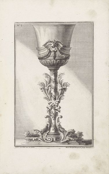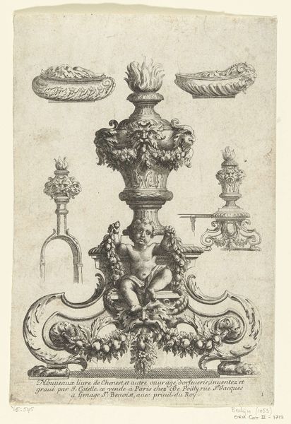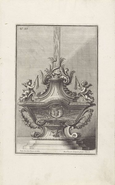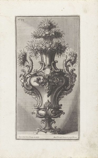 Editor: This engraving from 1714 by Maximilian Joseph Limpach, titled "Vase with two grotesque heads and garlands of flowers and fruit," is just stunning! All the ornamentation makes me wonder, what statements can we make about the Dutch Baroque from studying prints like these? Curator: It's tempting to see this simply as decoration, but the meticulous detail achievable through engraving reflects significant labor and skill. We need to consider the material implications: the paper itself, the ink, the engraver's tools, and the market for such images. It speaks to the rising merchant class. Editor: Right, the process… And who would even buy such an item? Curator: Precisely! Consider the social context. Who consumed these images and why? Were they for disseminating design ideas, demonstrating status, or even celebrating colonial expansion and the availability of exotic flora for such display? The grotesque heads intertwined with the garlands, are they commenting on the grotesque abundance made available by colonial exploits? Editor: Wow, so, beyond just appreciating it as art, we should think about the socio-economic implications inherent in its creation and consumption. Like a Baroque advertisement? Curator: Exactly! Prints like this become documents, not just objects of art. They represent networks of labor, trade, and taste. The engraving, then, is not merely a vase, but evidence of a particular moment in Dutch commercial and cultural history. A physical manifestation of social systems at work. Editor: This gives me a new appreciation for engravings! It's not just a pretty picture. Curator: It's a material artifact, reflecting the complicated machinery of its time.